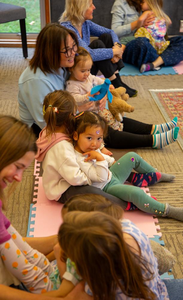 Each class begins with a hello song. “We then go through nine songs of gradually moving together, from choreographed dances to free movement, and everyone participates in playing instruments and singing. There’s lots of laughing and connecting.” It ends with O’Sheehan playing guitar and singing a lullaby, while children and caregivers lie down with the lights turned off.