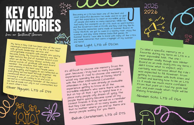 As the 2025-2026 service year concludes, I am grateful for the many learning opportunities presented by Key Club—those that I have experienced, and those that are afforded to each individual Key Club member. Throughout our time in Key Club, I find it is important to always remember the purpose of our organization: to provide opportunities for individuals to develop leadership through the vehicle of service.