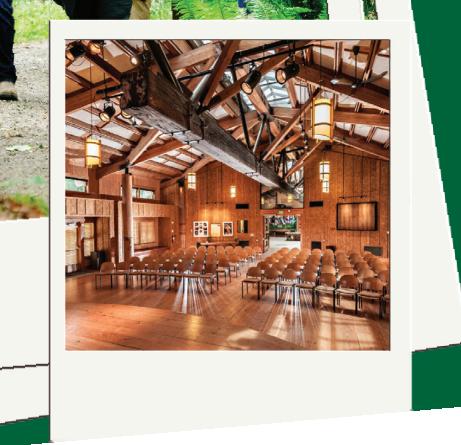 From vows under evergreens to retreats that spark ideas, our forested campus blends rustic elegance, inspiring spaces, and locally-sourced, sustainable cuisine that brings people together.