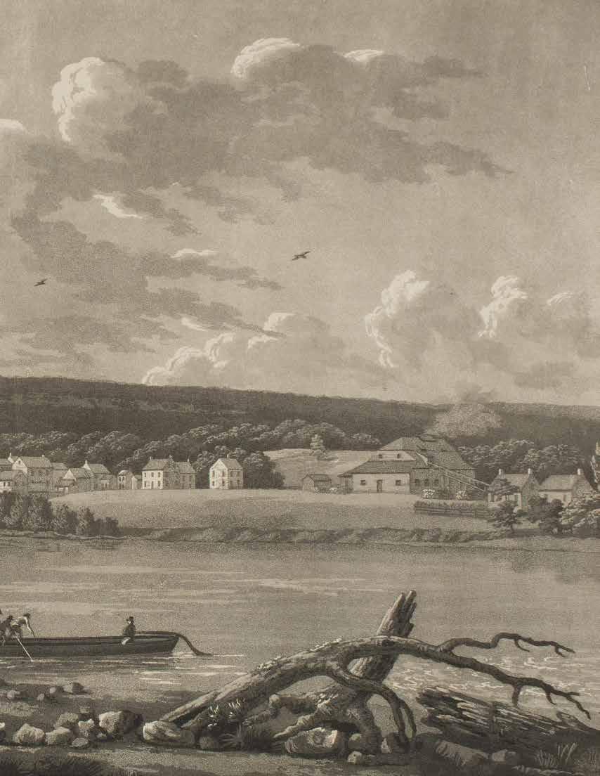 > Crew members use poles to propel a Durham boat (in foreground) up the Delaware toward the Delaware Water Gap. A ferryboat crosses the river in the center of this1820 picture by Thomas Birch. Engraving by William Strickland.