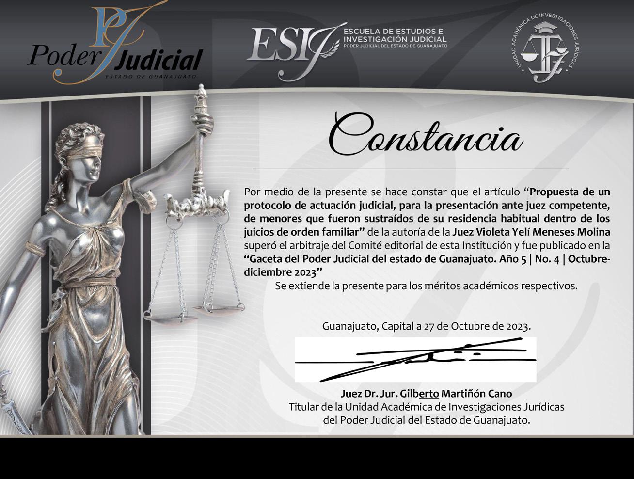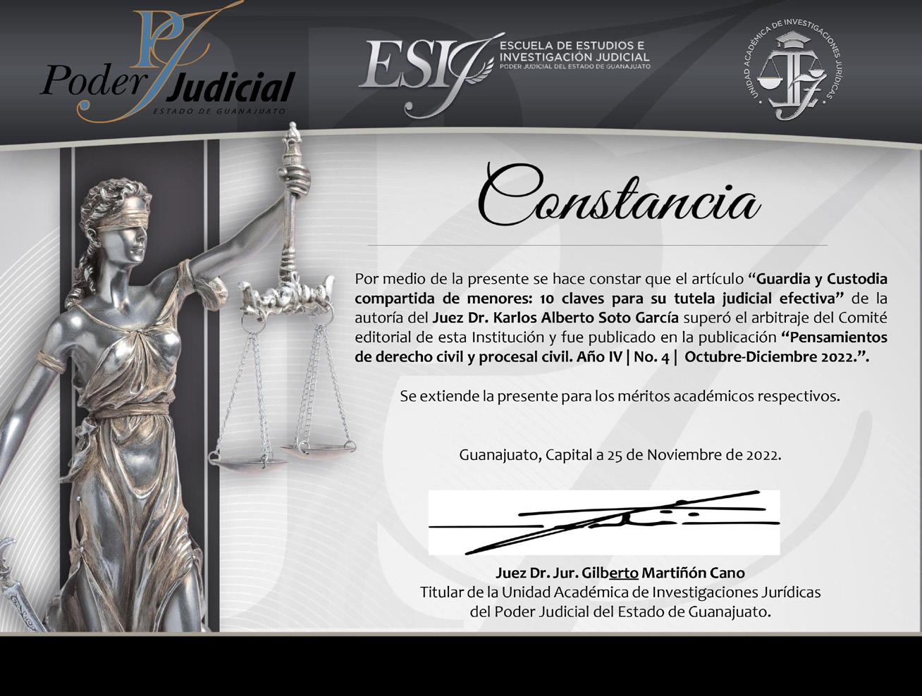 La presente publicación es la colección de las constancias que han recibido los autores que participaron en las publicaciones de la unidad académica de investigaciones jurídicas del poder judicial del estado de Guanajuato, integradas por la Gaceta Judicial, y las revistas Pensamientos de derecho civil y procesal civil y Mentes penales.