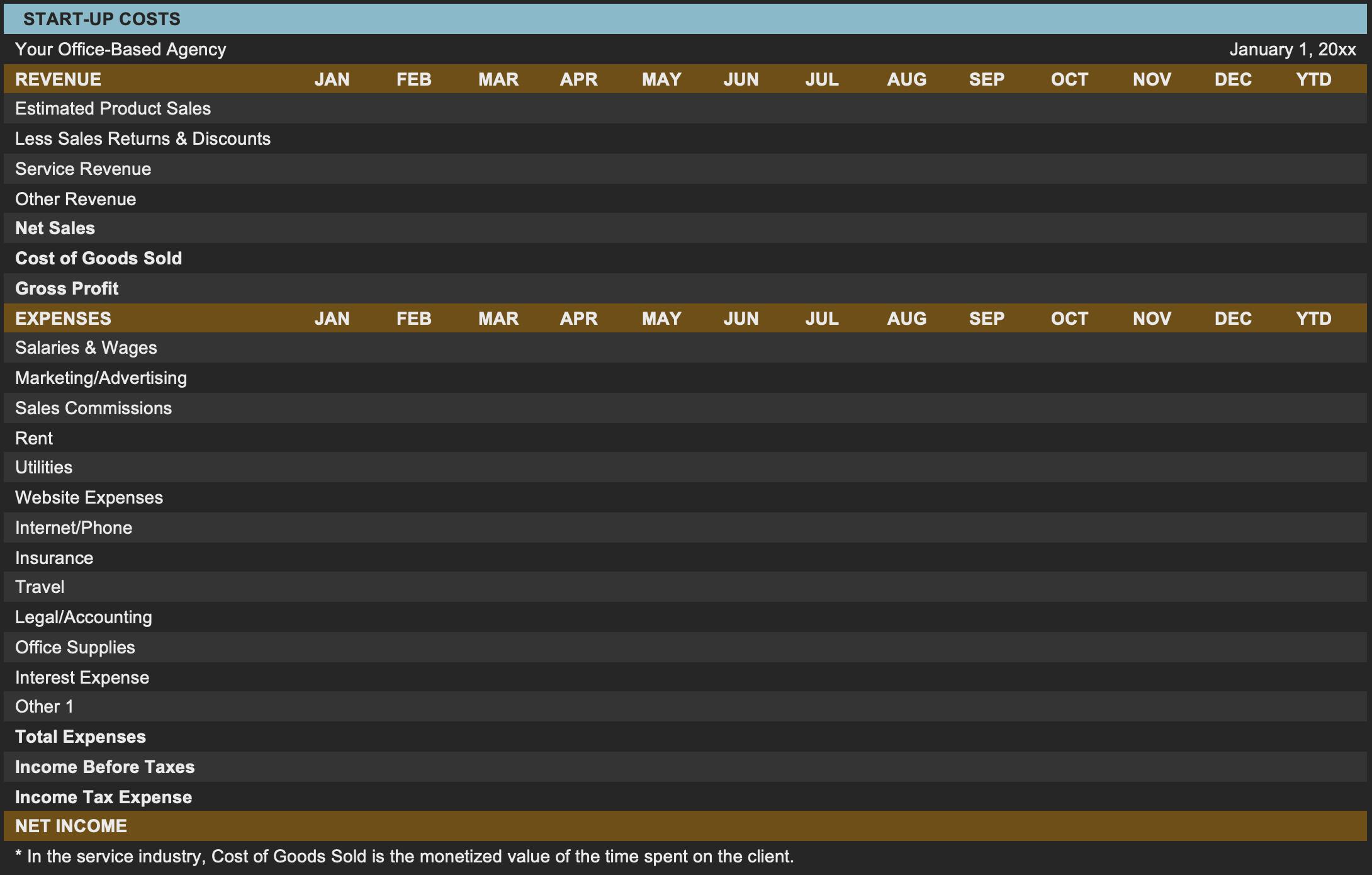 For each month, beginning in January or whenever the start is estimated, enter the expected sales to be. This could be for a single service or multiple services. Add lines to this model for additional