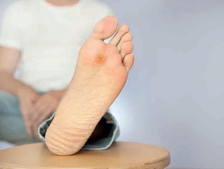 Una de las afectaciones más frecuentes en la piel del diabético se mani esta en sus pies: “pie diabético”, siendo una de las principales causas de amputación no traumática. El riesgo de infección por hongos y bacterias aumenta debido a la disminución de la inmunidad celular causada por la hiperglucemia y los