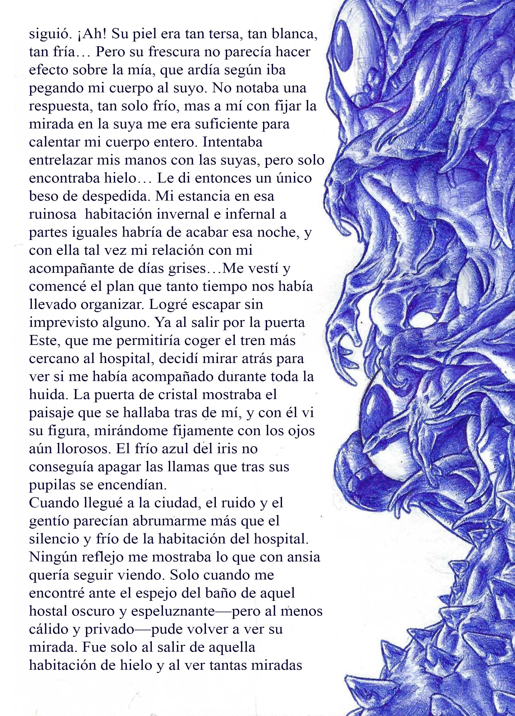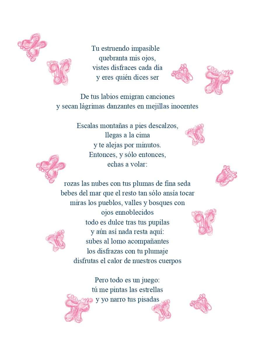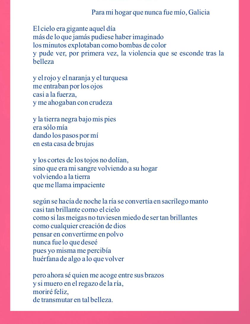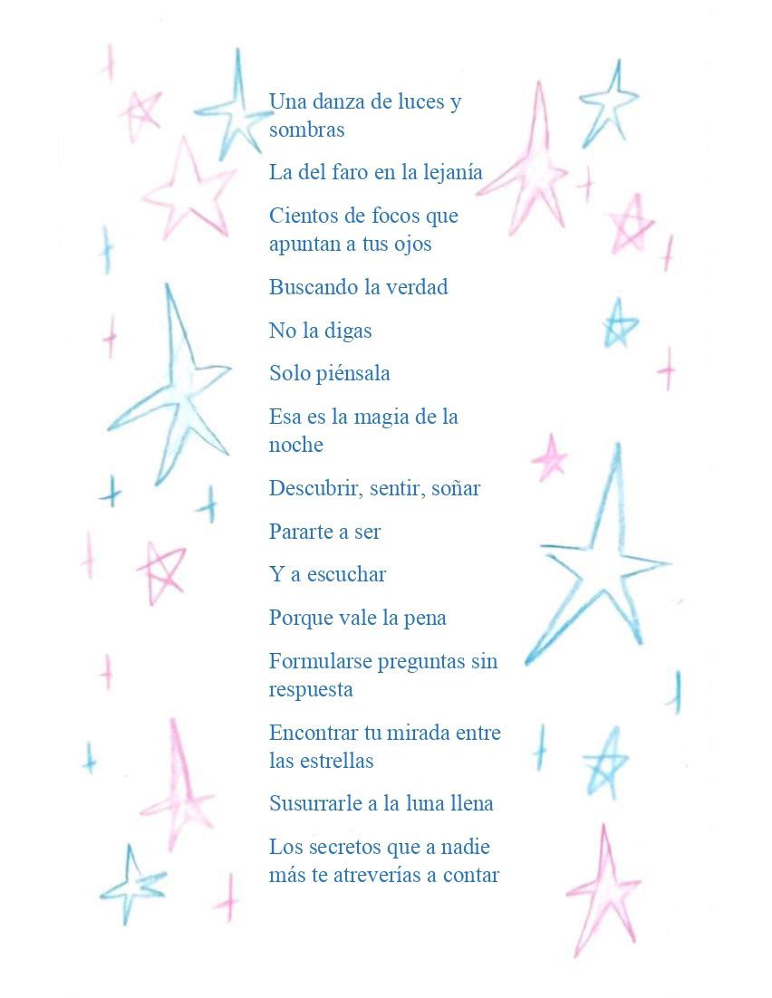 Olvide, pues, estos párrafos anteriores y acompañe a Carmen, Clara, Alba, Blanca, Jimena, Encarna, Nel, Alejandra, Elvira, Lucía, Rafael, Ariadna, Agar, Gema, Héctor, María, Allende, Alejandro, Erika, Esperanza, Andrés, Miguel Ángel, Jorge, María Jesús, Mila, Estrella, Fátima, Meri, Odiarte, Adriana, Carmen, Cristina, Rober, Sara, Manuel, Elena, Jennifer y Virginia, por sus noches y paisajes más o menos serenos o inquietantes, versos con aroma a Machado y a Lorca, putas y musas que quieren dejar de serlo, seres mitológicos u otras extrañas criaturas que parecen ocultarse bajo la cama, por locales enigmáticos donde se cuelan carniceras hamletianas y futuros ganadores del Nobel de Literatura, mares, tierra gallega, lunas crecientes o menguantes, espaldas y lunares cubiertos por largas melenas, por ojos que se cierran y rostros que lloran o desaparecen bajo formas geométricas o bajo los pies que nos sustentan y, sobre todo, recuerde que: