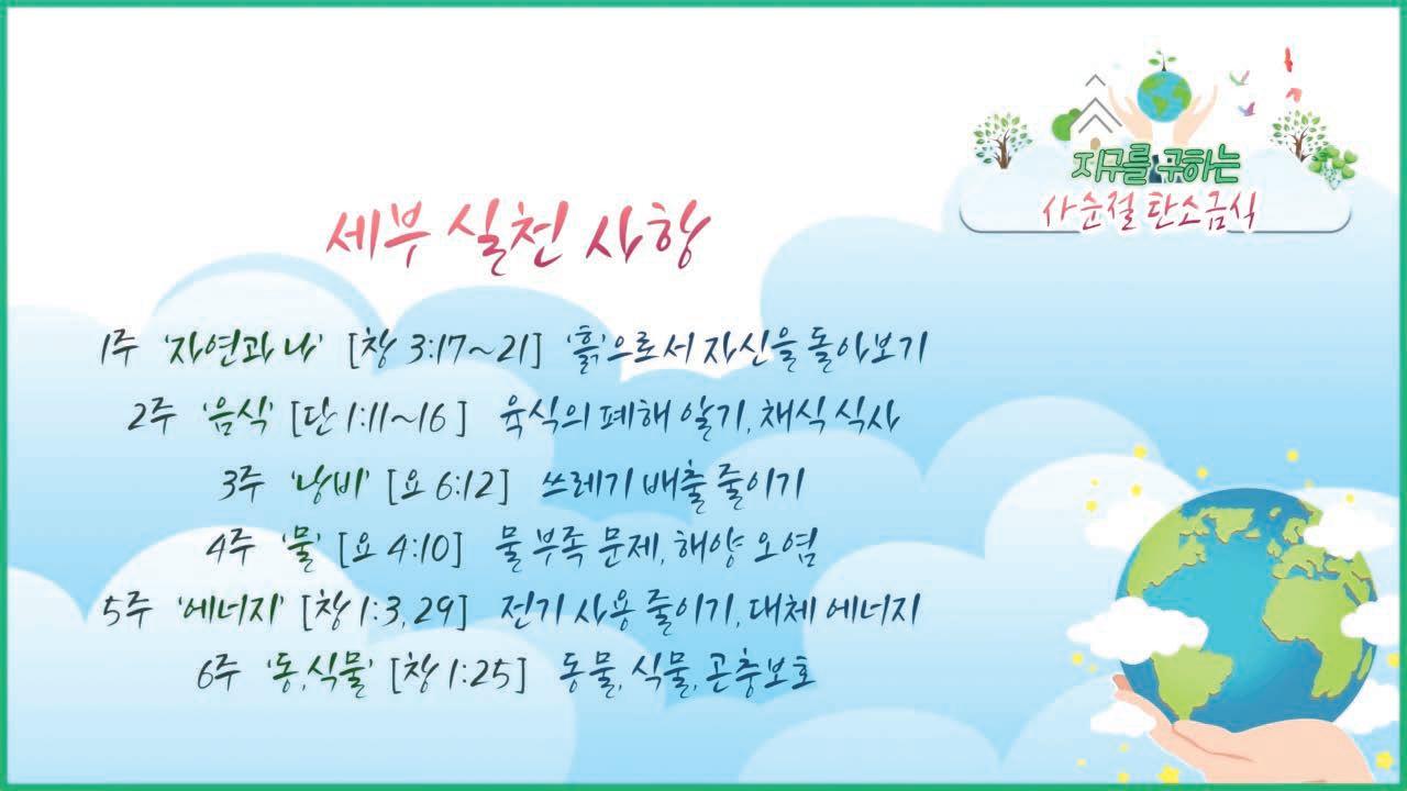 6주 동안, 매주 각각 “자연과 나”(창 3:17~21), “음식”(단 1:11~16), “낭비”(요 6:12), “물”(요 4:10), “에너지”(창 1:3, 29), “동, 식물”(창 1:25)을 주제로 진행합