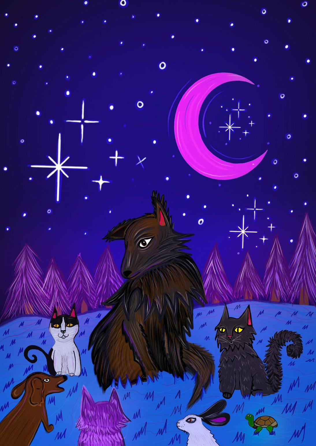 Proklouzla ven z domu a proběhla nočním městem do lesa, kde se takto zvířátka scházela. To vám byla mýtina uprostřed lesa. Odpoledne tam občas byli lidé, ale v noci byla pustá a prázdná, ideální místo pro tajné schůzky. Cindy byla jezevčík, měla sice malé nožičky,