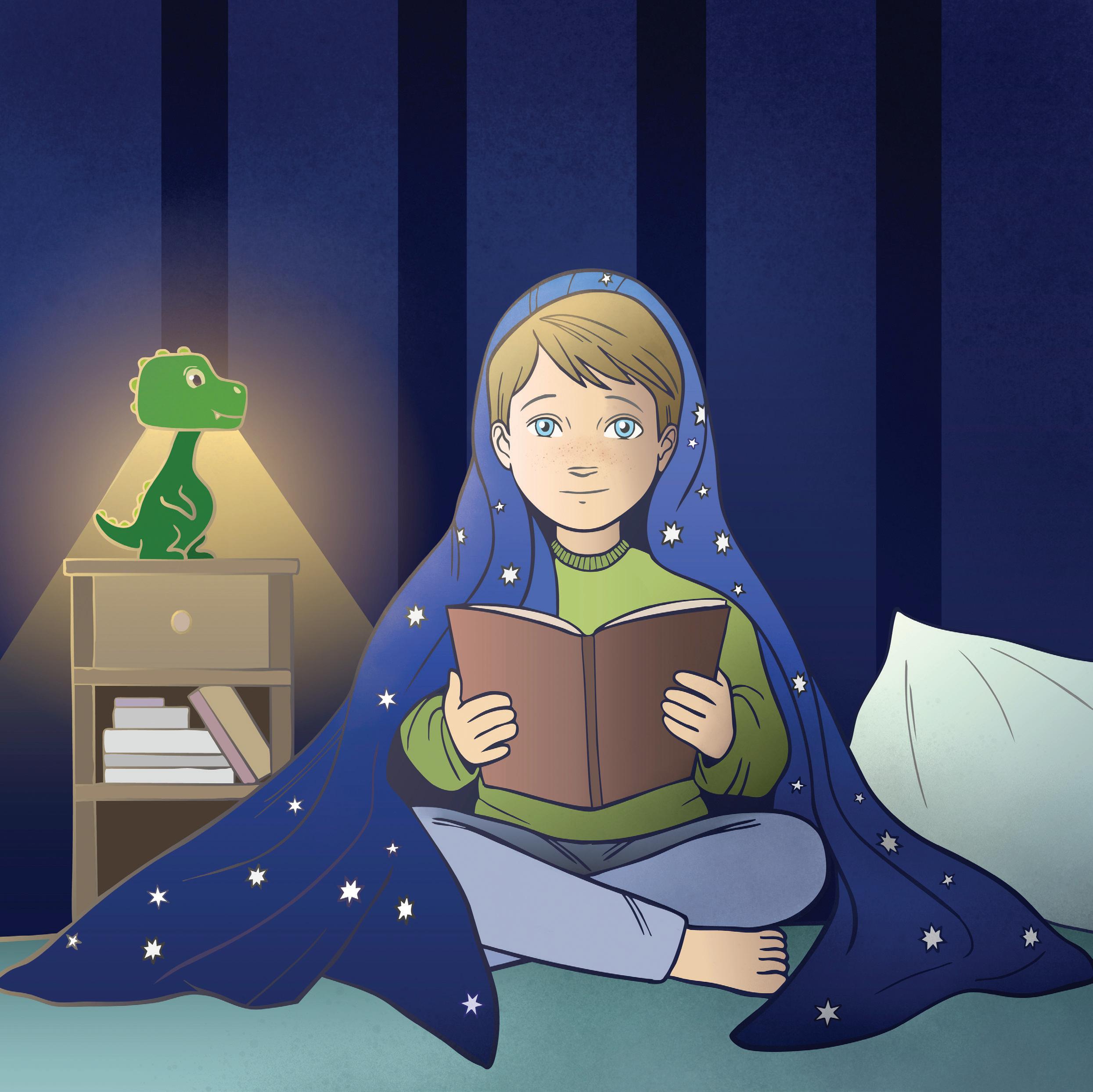 hvězdičkami. Všude kolem něj se rozprostírala tma, která šeptala a šuměla v každém rohu jeho pokoje. Jediná věc, která ho uklidňovala, byla jeho lampička s dinosaurem.