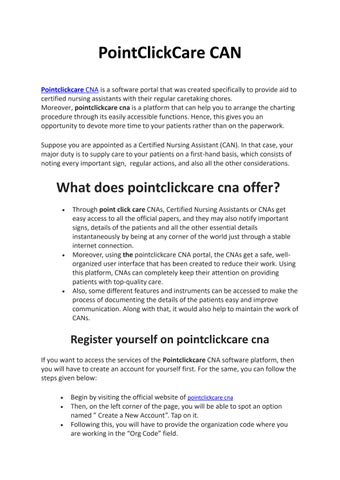 • Moreover, using the pointclickcare CNA portal, the CNAs get a safe, wellorganized user interface that has been created to reduce their work. Using this platform, CNAs can completely keep their attention on providing patients with top-quality care.
