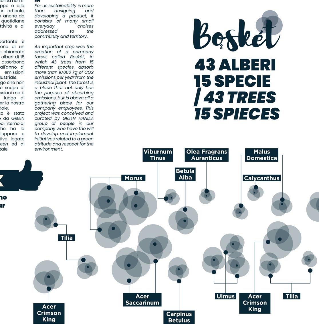 Abbiamo investito in un piccolo bosco “Bosket”; è un’area pensata e realizzata in vicinanza di uno degli spazi produttivi e tutto questo per continuare il processo di sostenibilità aziendale avviato oramai da anni.