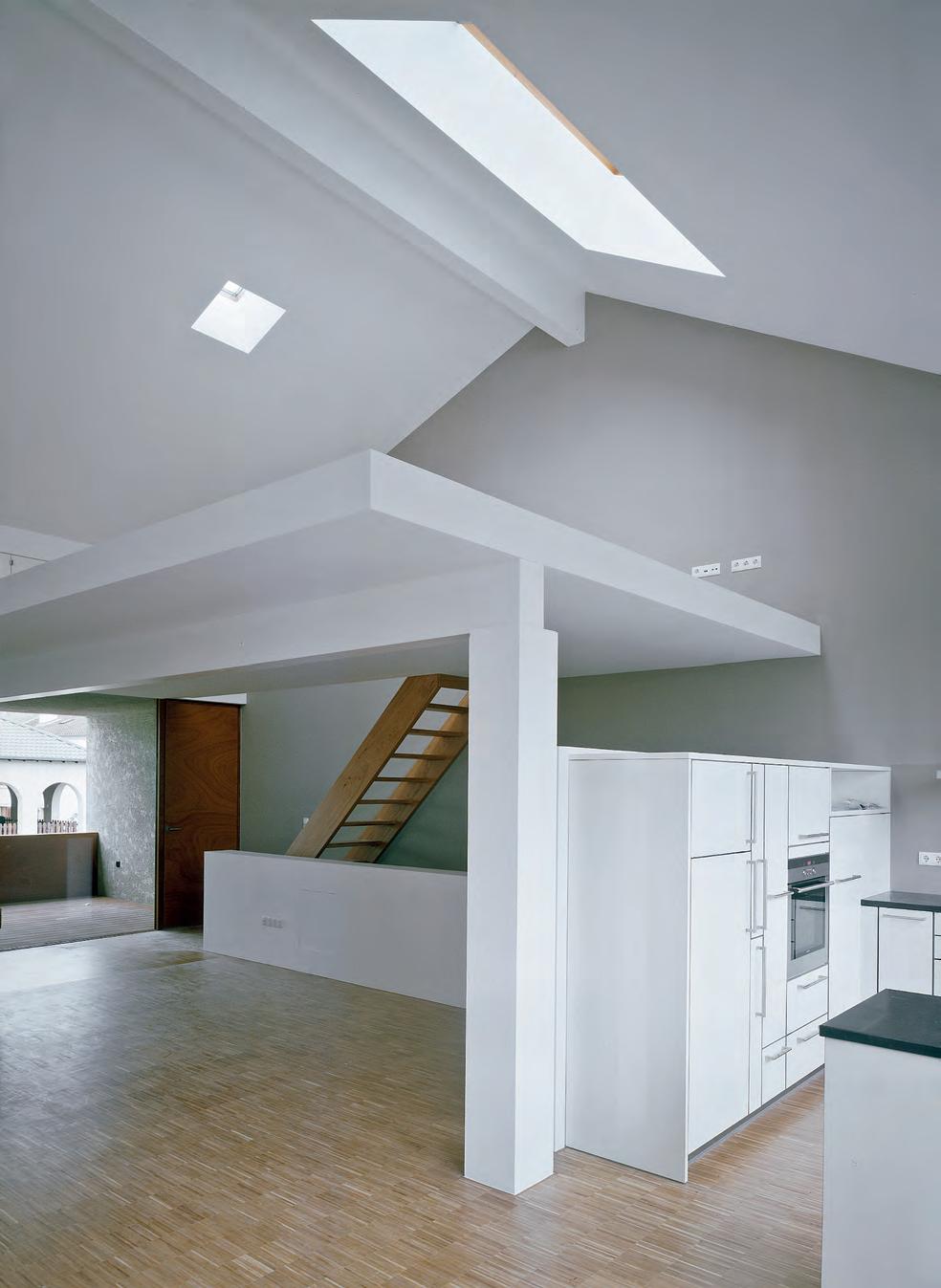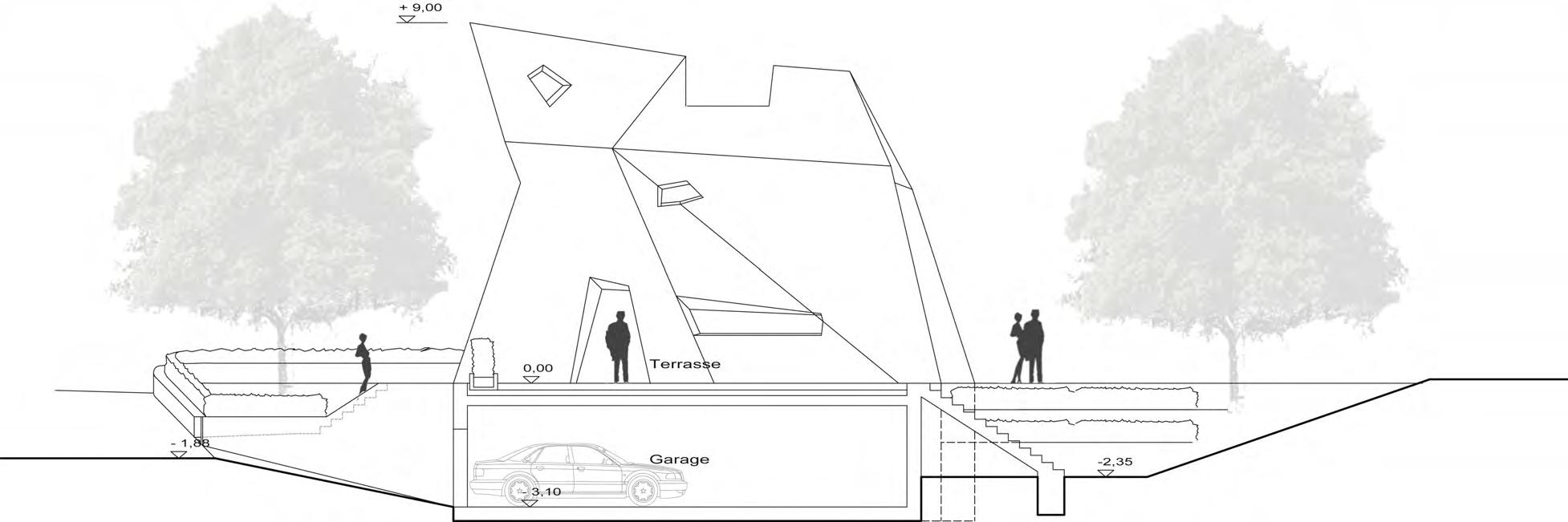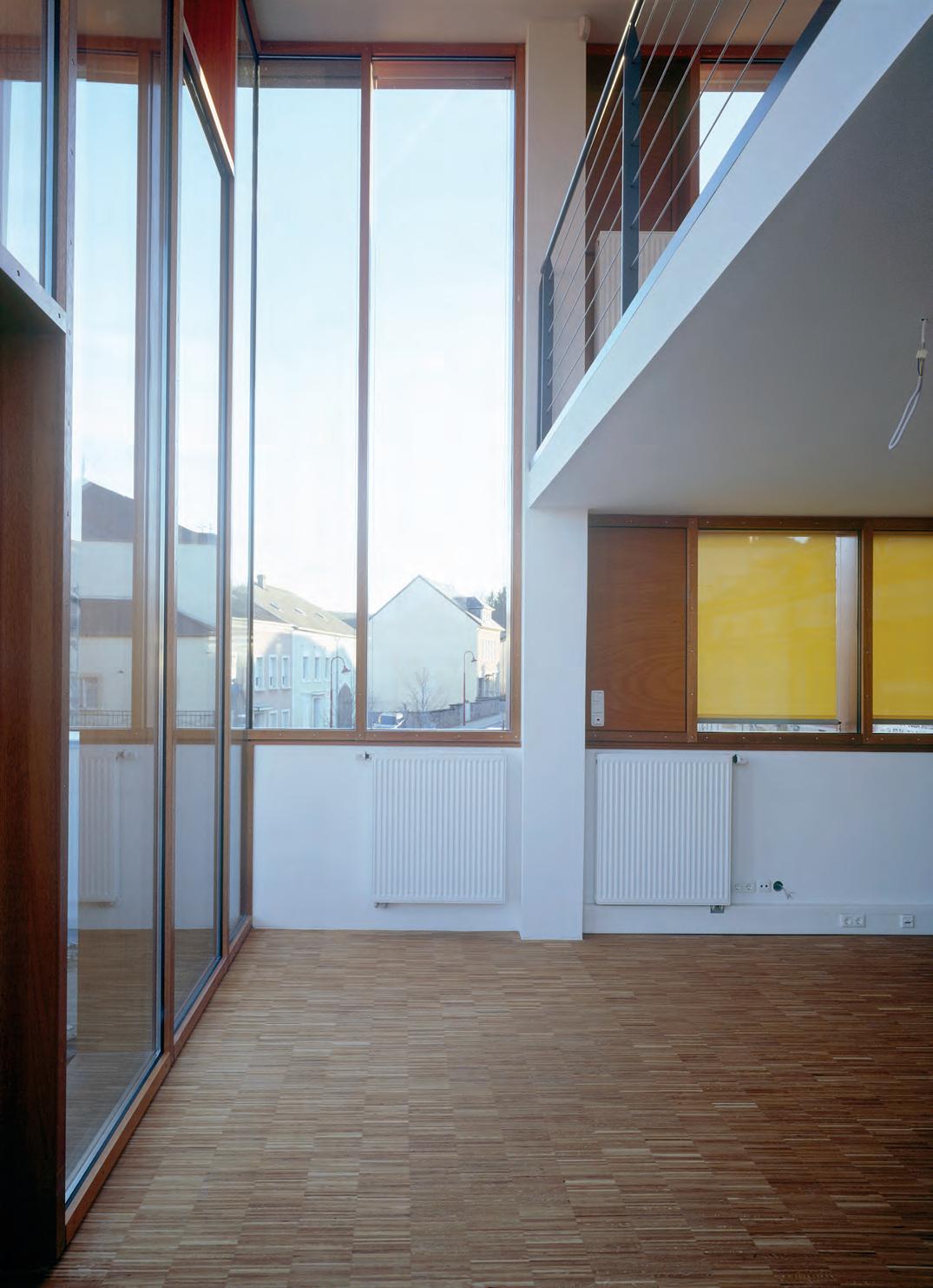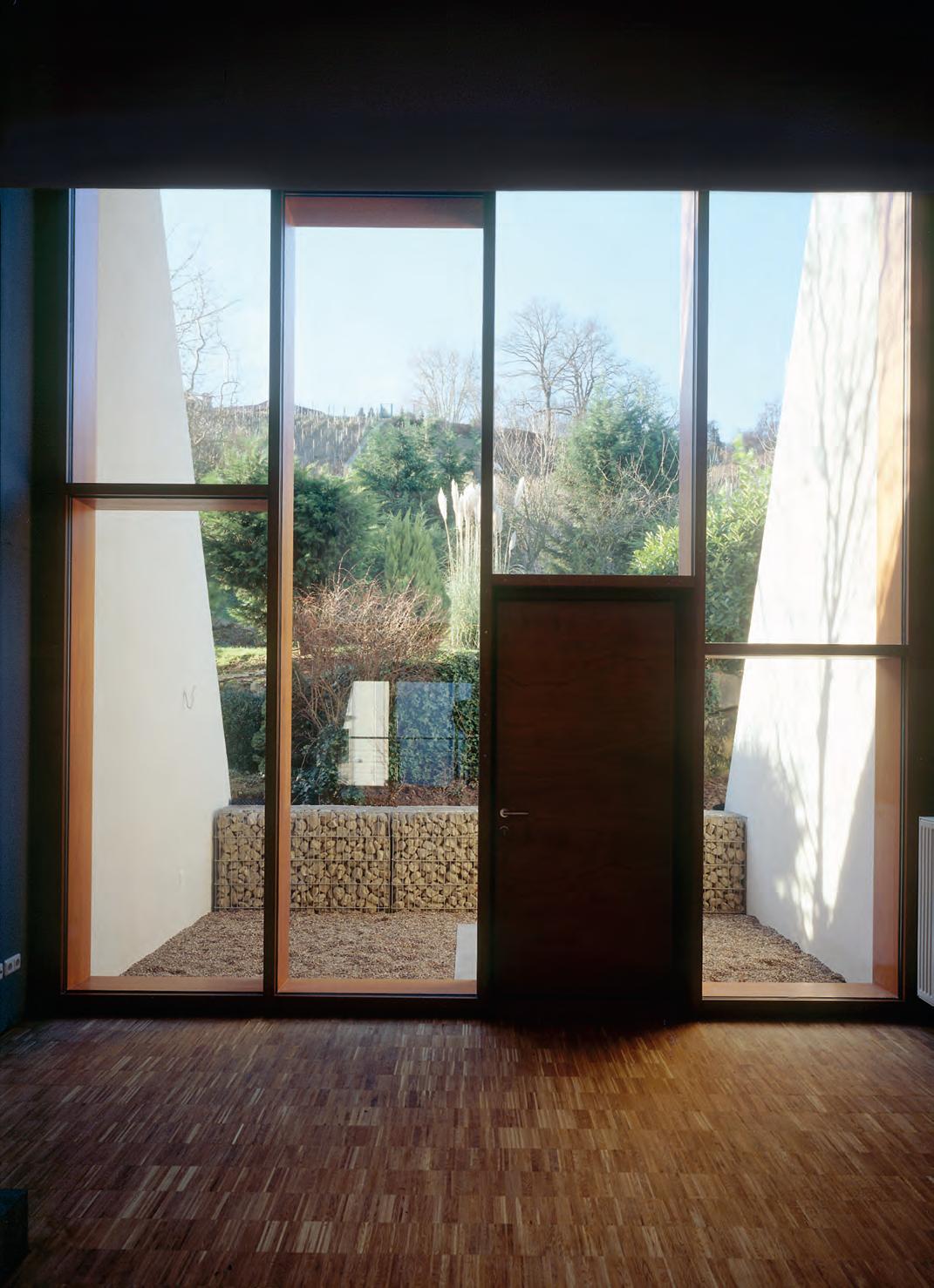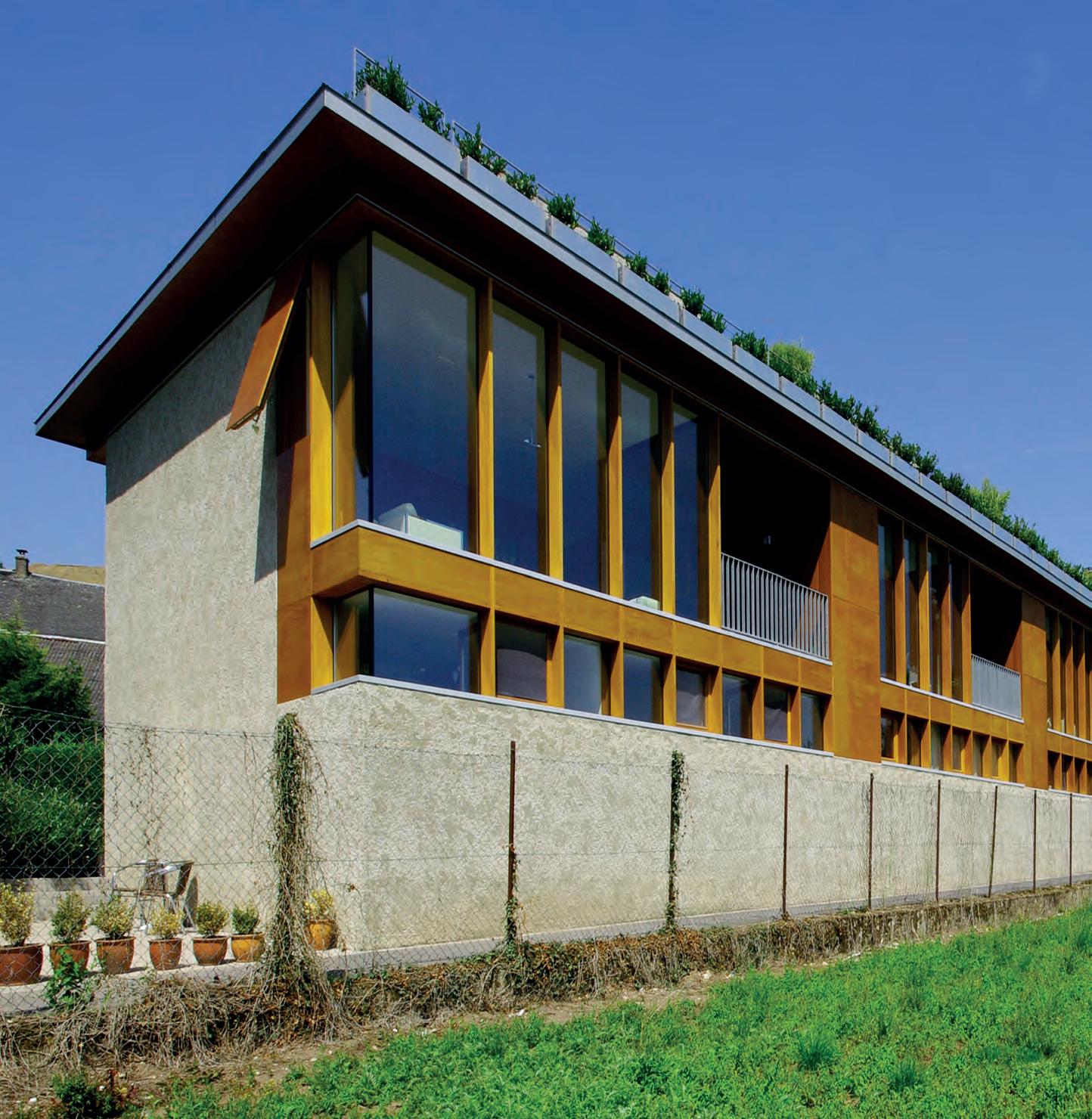 À Wellenstein, nous avons construit la maison Hirtt-Gasper, réalisée entre 1999 et 2001. Elle suit les théories du philosophe grec Socrate – théories reprises, plus tard, par Leon Battista Alberti (1404–1472), philosophe et architecte du Quattrocento – de la maison de type méditerranéen, avec un toit relevé du côté où arrive le soleil, pour que les rayons entrent profondément dans la maison. Il s’agit d’une maison à deux étages, d’une forme qui ressemble à un entonnoir, orientée vers le sud pour capter le soleil.