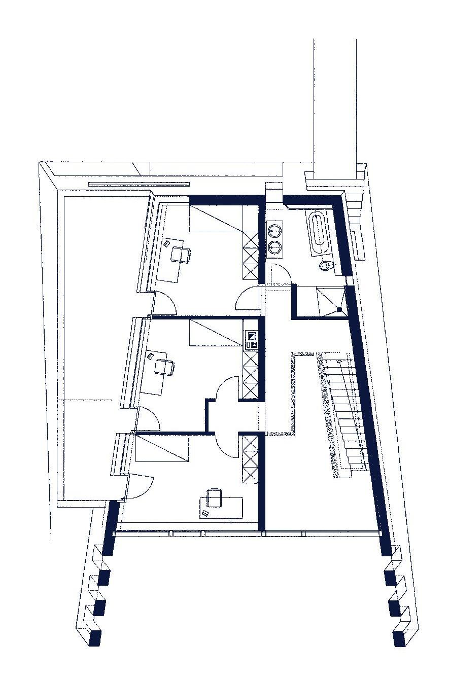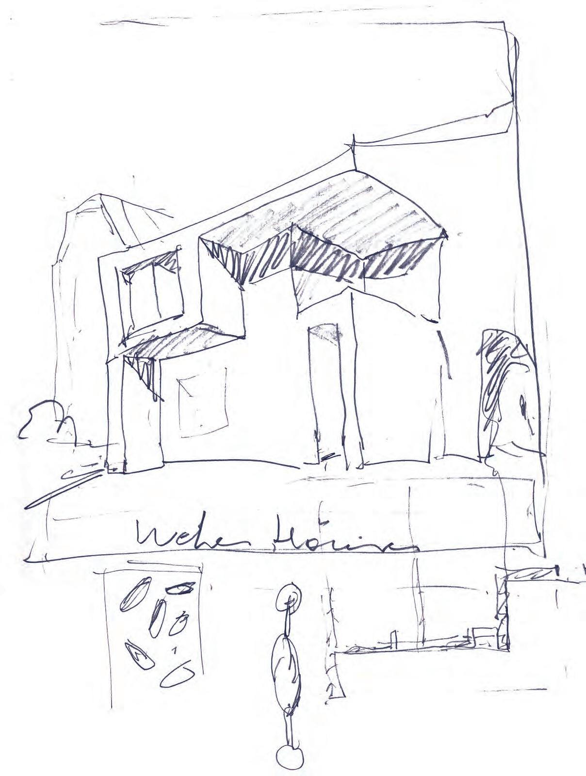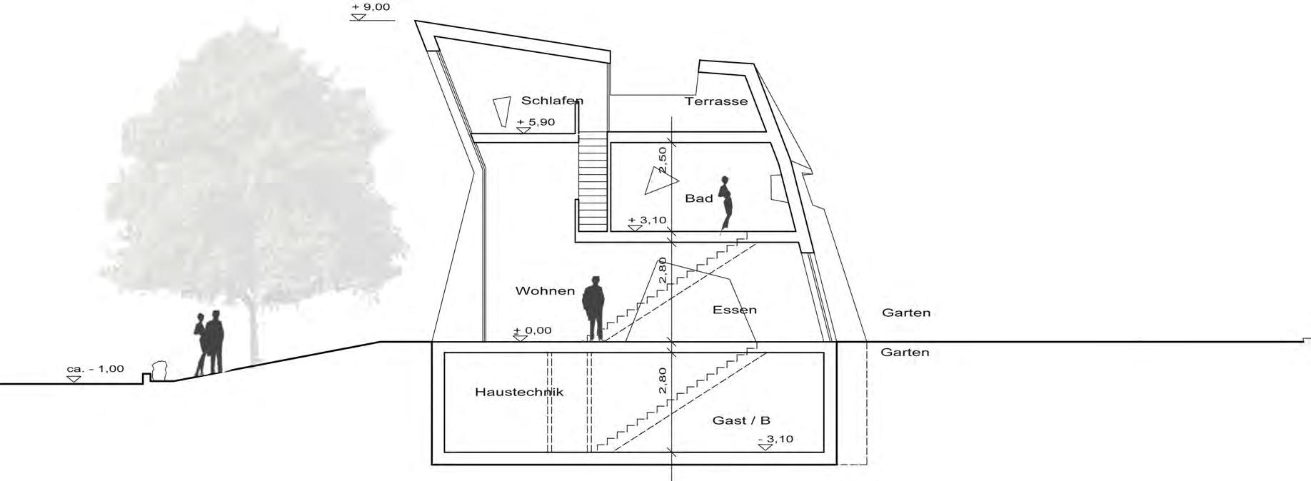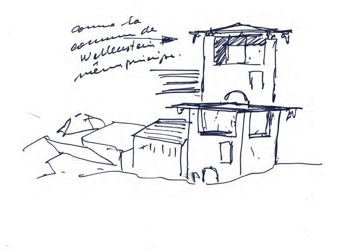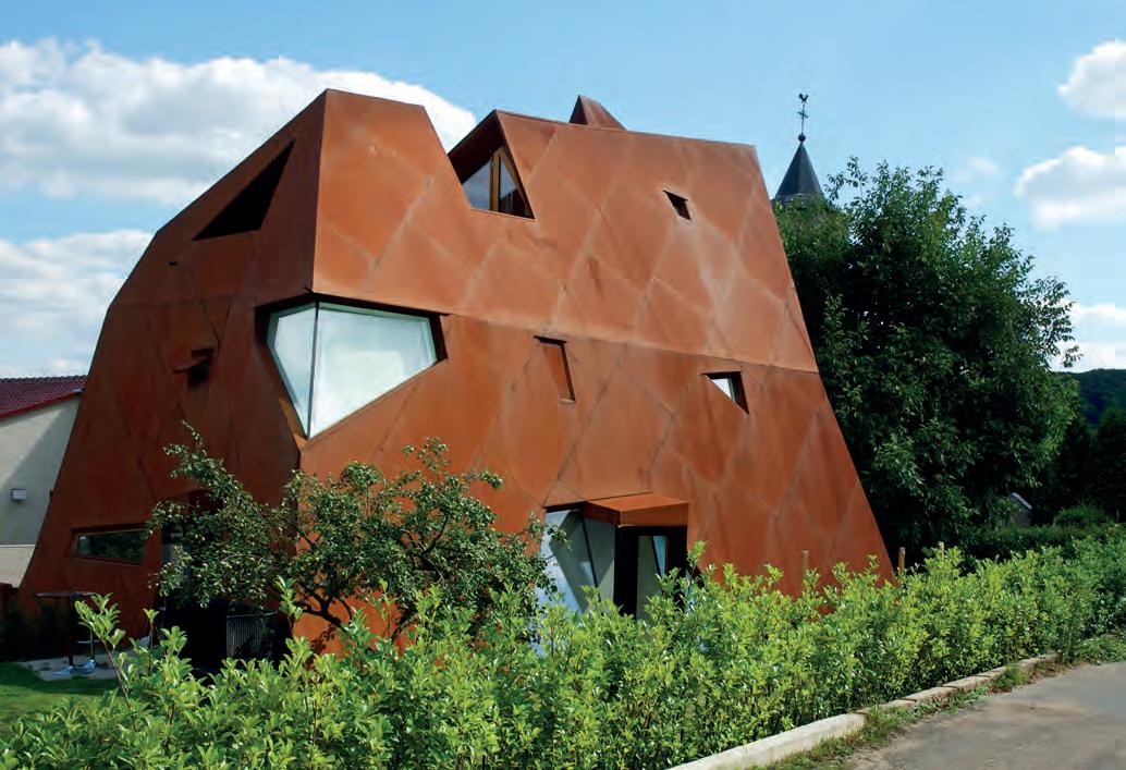 À Wellenstein, nous avons construit la maison Hirtt-Gasper, réalisée entre 1999 et 2001. Elle suit les théories du philosophe grec Socrate – théories reprises, plus tard, par Leon Battista Alberti (1404–1472), philosophe et architecte du Quattrocento – de la maison de type méditerranéen, avec un toit relevé du côté où arrive le soleil, pour que les rayons entrent profondément dans la maison. Il s’agit d’une maison à deux étages, d’une forme qui ressemble à un entonnoir, orientée vers le sud pour capter le soleil.