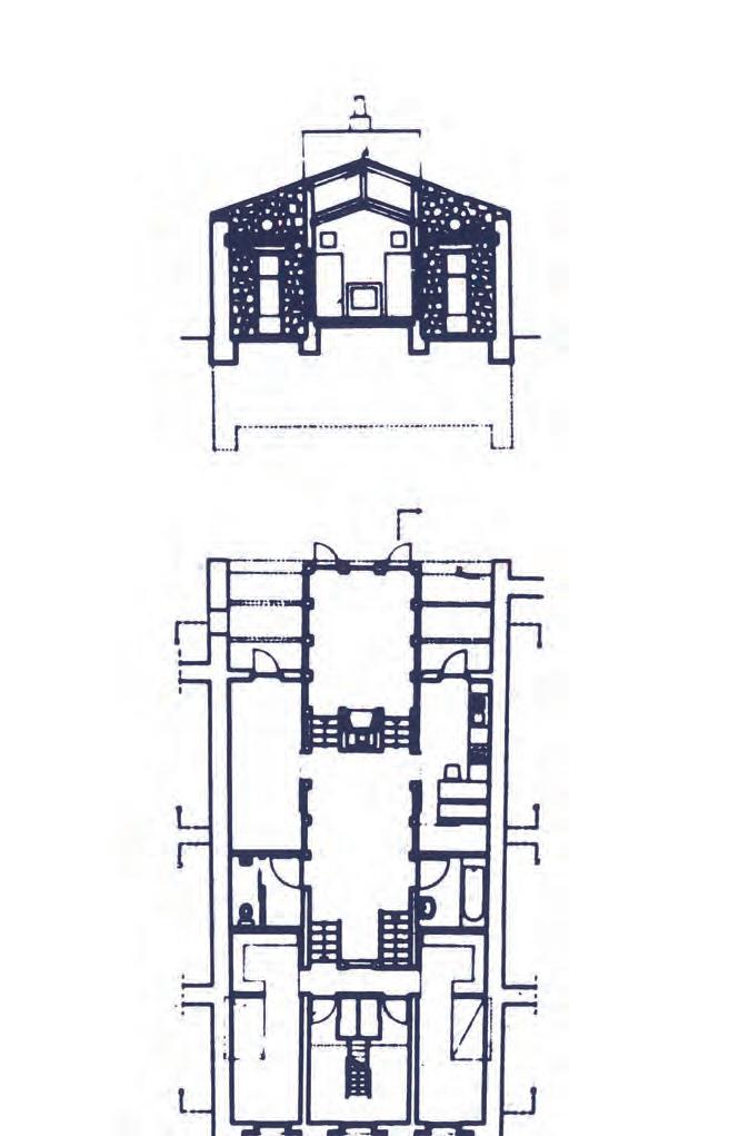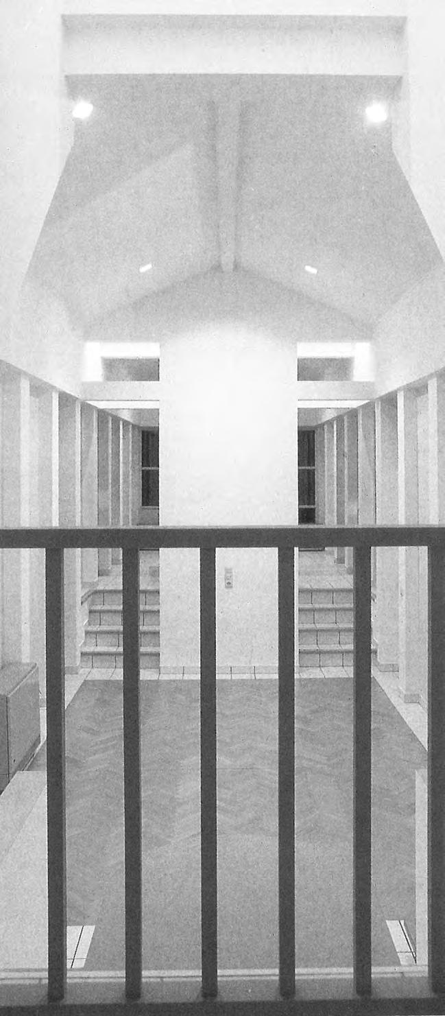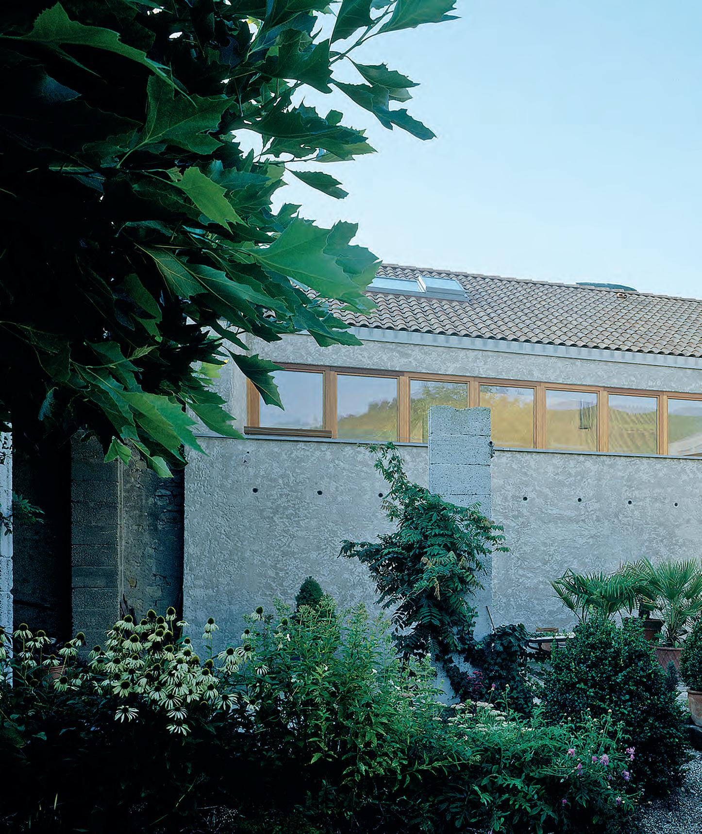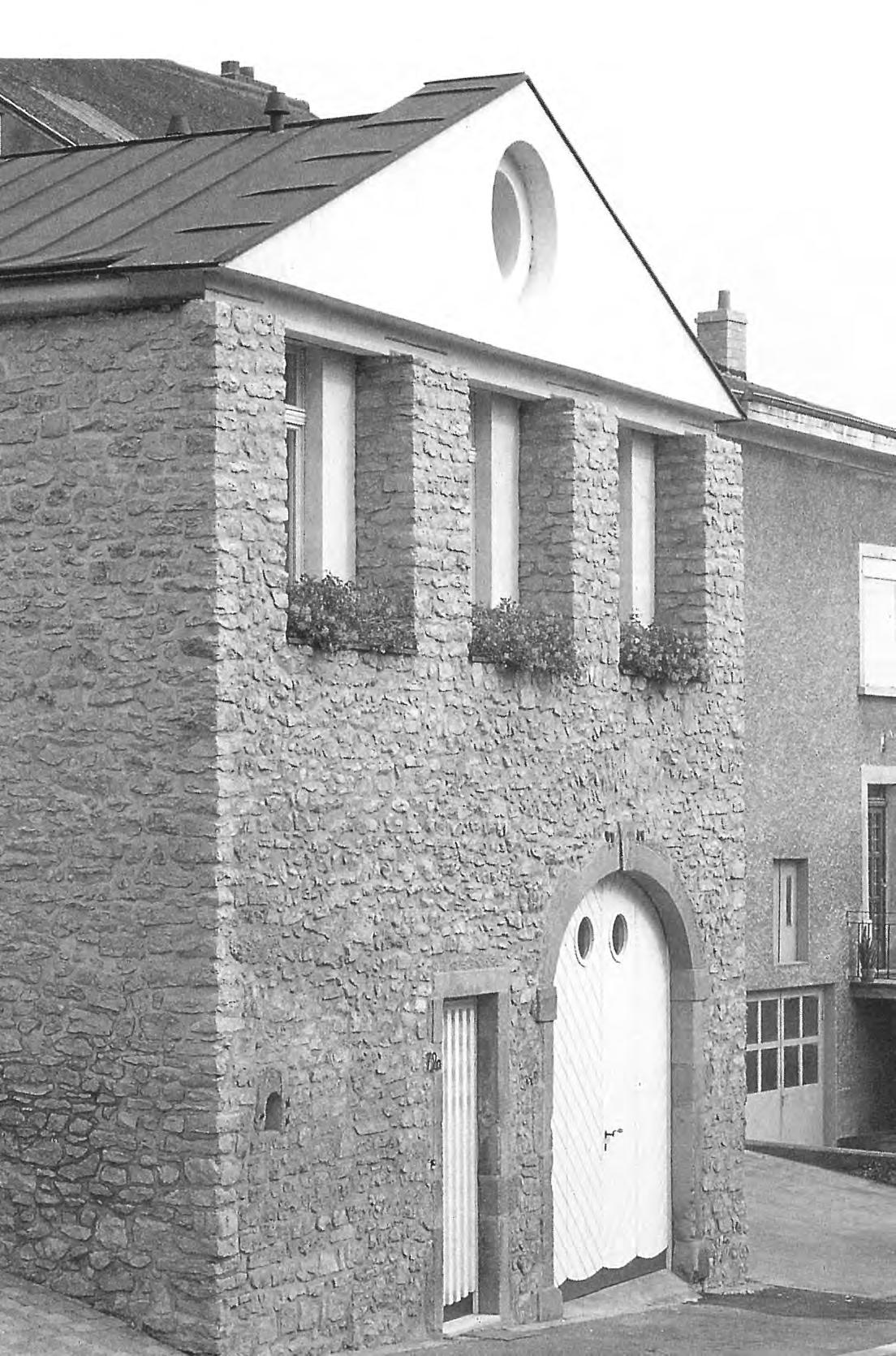 Un de nos tout premiers projets de maison unifamiliale a été réalisé entre 1985 et 1987 à Schengen, pour la famille Ruppert. Nous y avons transformé une grange dépassant des vignobles, au centre d’un petit village mosellan, en une maison de vigneron fonctionnelle avec un appartement et une cave. La façade était en pierre sèche : une structure très classique. La conception prévoyait un vide dans le bâtiment même, une grande salle à manger située au centre, espace central autour duquel toutes les pièces adjacentes se regroupaient, à divers niveaux, souligné encore par deux puits de lumière.