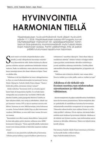 HYVINVOINTIA HARMONIAN TIELLÄ Yliopistokeskuksen hyvinvointityöryhmä Hyrrä järjesti Hyvinvointipäivän 17.1.2018. Yliopistokeskuksen aulassa riitti tungosta, kun eri näytteilleasettajat mainostivat niin opiskelijapartiolaisten toimintaa kuin Slice-palveluita. Huomiota keräsivät myös Fudoshi Aikido Dojon harjoitukset aulassa. Pointin päätoimittaja Atte oli paikan päällä tutustumassa tapahtuman tarjontaan.