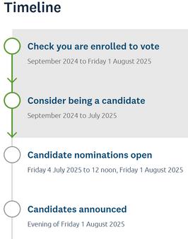 If you are enrolled to vote you will receive a voting form in your letterbox between Tuesday 9 September to Monday 22 September 2025 Voting runs from Saturday 11 October 2025, with results announced from Monday 13 October to Friday 17 October 2025