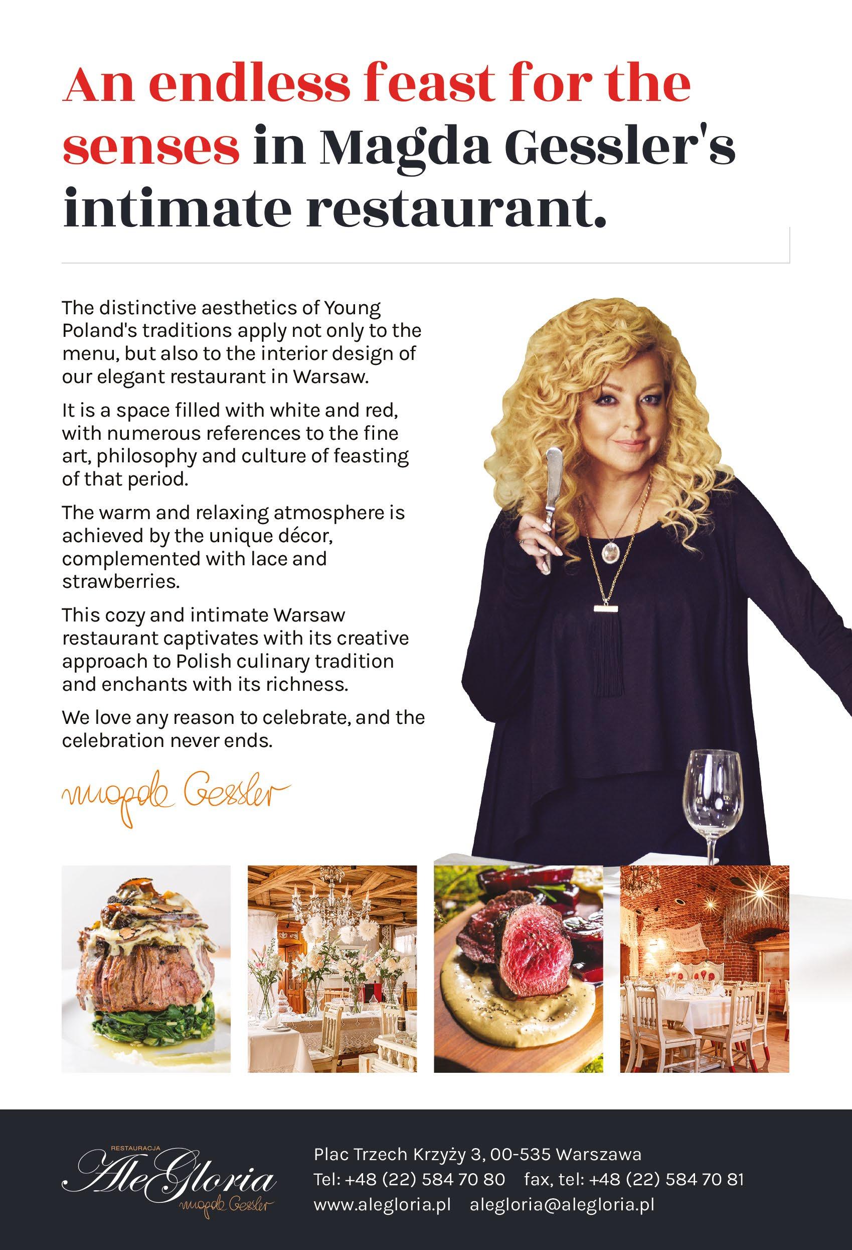 Magnificent, enjoyably over-the-top restaurant in the finest part of Warsaw where the strawberrythemed decor appears amazingly at home and where their take on modern Polish cuisine will leave you determined to come back for more. AleGloria is another successful gastronomic venture looked over by the discerning eye of Magda Gessler (for those who don’t know the name, she is Poland’s most successful celebrity chef) and, therefore, it makes sense how such a restaurant can so seamlessly present the pure pleasure and simplicity of Polish cuisine while at the same time elevating it to world-class gourmet standards! Amongst the tantalising dishes with lavish descriptions on the menu, goose meat makes a lot of regular appearances, as well as other eccentric birds like ducks and gamey cuts of venison. Delicious! The whimsical interior includes an illuminated salt-brick bar, with an impressive range of alcoholic beverages, including a concise list of red and white wines. Matching the boarding and fluffy bits hanging off