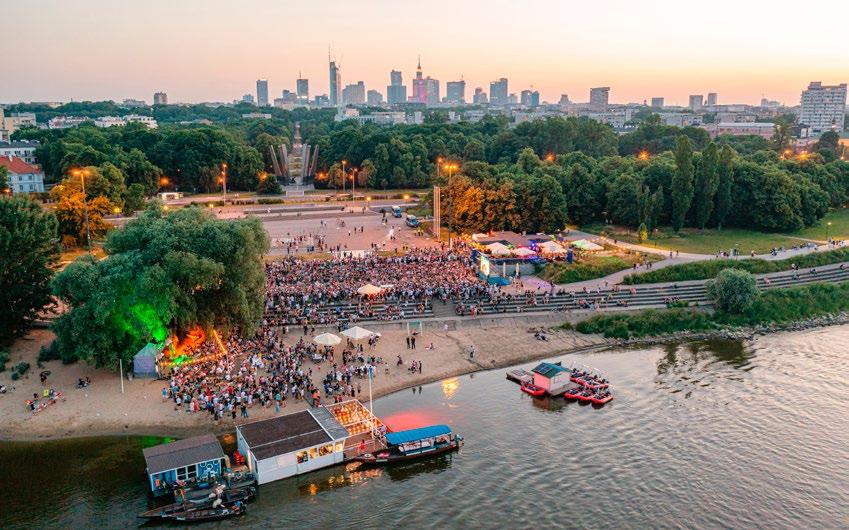 The main gateway to the river for most Varsovians is the M2 Metro stop ‘Centrum Nauki Kopernik,’ which deposits you right on the water (I-6). Bulwary Wiślane (The Vistula Boulevards) is full of notable sightseeing points and cultural institutions (read about those on p.44), the areas between are recreational spaces and beach front, that are a pleasure to spend time in. Additionally, there’s no shortage of cafes, bars, restaurants, ice cream stands, food trucks and river barges where you can find great food and refreshments. In the evening, check out Przystań Nowa Fala - a popular two-level riverbarge with food, drinks and DJ parties parked right in front of the museum (H-5). Similarly, just south of the Metro, BarKa is another popular barge that hosts gigs and guest DJs and is regularly mobbed with partiers, creating an entire scene in its extended orbit on that part of the riverbank (I-6).