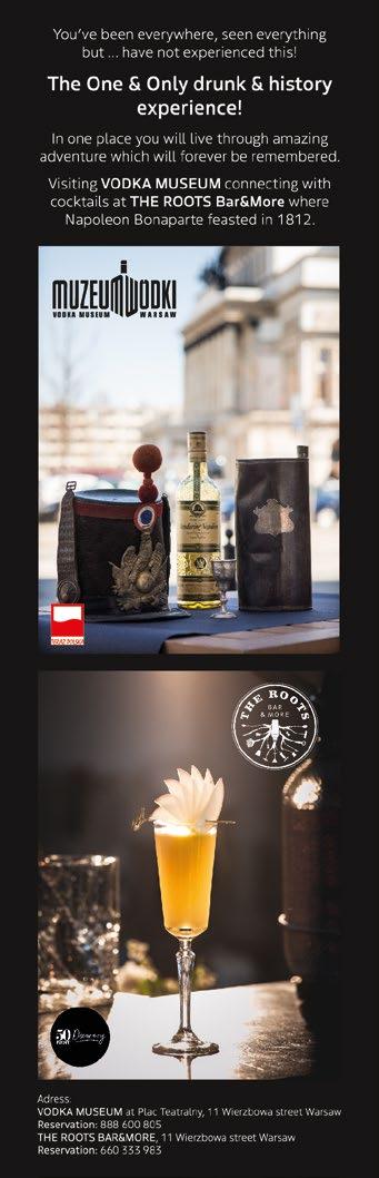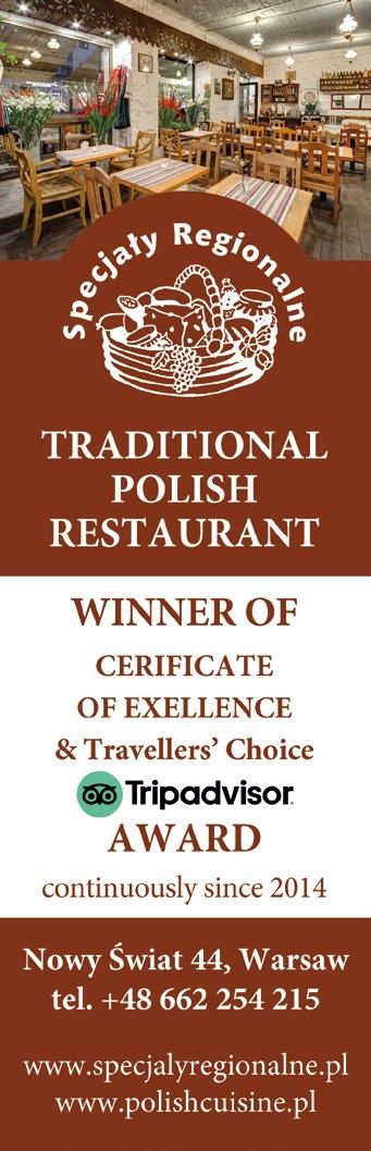 Top marks to the masterminds behind this classy establishment. At their Vodka Atelier, you can try some 800 vodkas from around Poland and the globe; the range goes from PRL era classics to Polish ‘small batch’ distillers, designer vodkas, and flavoured vodkas. Also offered are six different types of Młody Ziemniak vodka (made from young potatoes) with varieties dating from 2017 (49 zł) to 2022 (25zł). The label of each tells you about the vintage and what the weather and climate were like during its production. The restaurant itself features stunningly presented, contemporary takes on Polish classics with a unique food and vodka pairing system. This spot is an Absolut (pardon the pun!) top-spot and a truly unique venue on Warsaw’s culinary map. Check out their lunch offer from Mon-Fri 12:0016:00. Kitchen open until 22:20QF-5, ul. Wierzbowa 9/11, MRatusz Arsenał, tel. (+48) 22 828 22 11, www. domwodki.pl. Open 12:00-24:00. €€€€. T