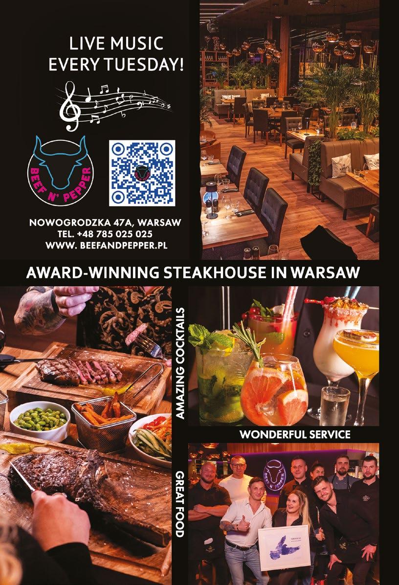 A favourite for jazz, burlesque shows and live musical adventures in Warsaw, Le Cabaret Jazz Bistro's smallbut-charming garden space on Nowogrodzka has an unbeatable atmosphere, lined with old tenement houses and complemented by a free-spirited soundtrack! Browse their tapas-style collection that includes both hot and cold appetizers, such as herring in a sherry marinade, oyster mushroom ceviche, tuna marinated in ponzu and gin, and roasted eggplant rolls. Founder Marcin Wachowicz has been included in the Top 50 best restaurateurs in Poland as recognized by Forbes & FOR 2023, giving you some idea of the level of hospitality put into this place. Highly recommended for a great evening out in Warsaw.QG-8, ul. Nowogrodzka 4, MCentrum, tel. +48 536 97 64 03. Open 12:00-23:00; Thu, Fri, Sat 12:0000:00. €€. TUE6