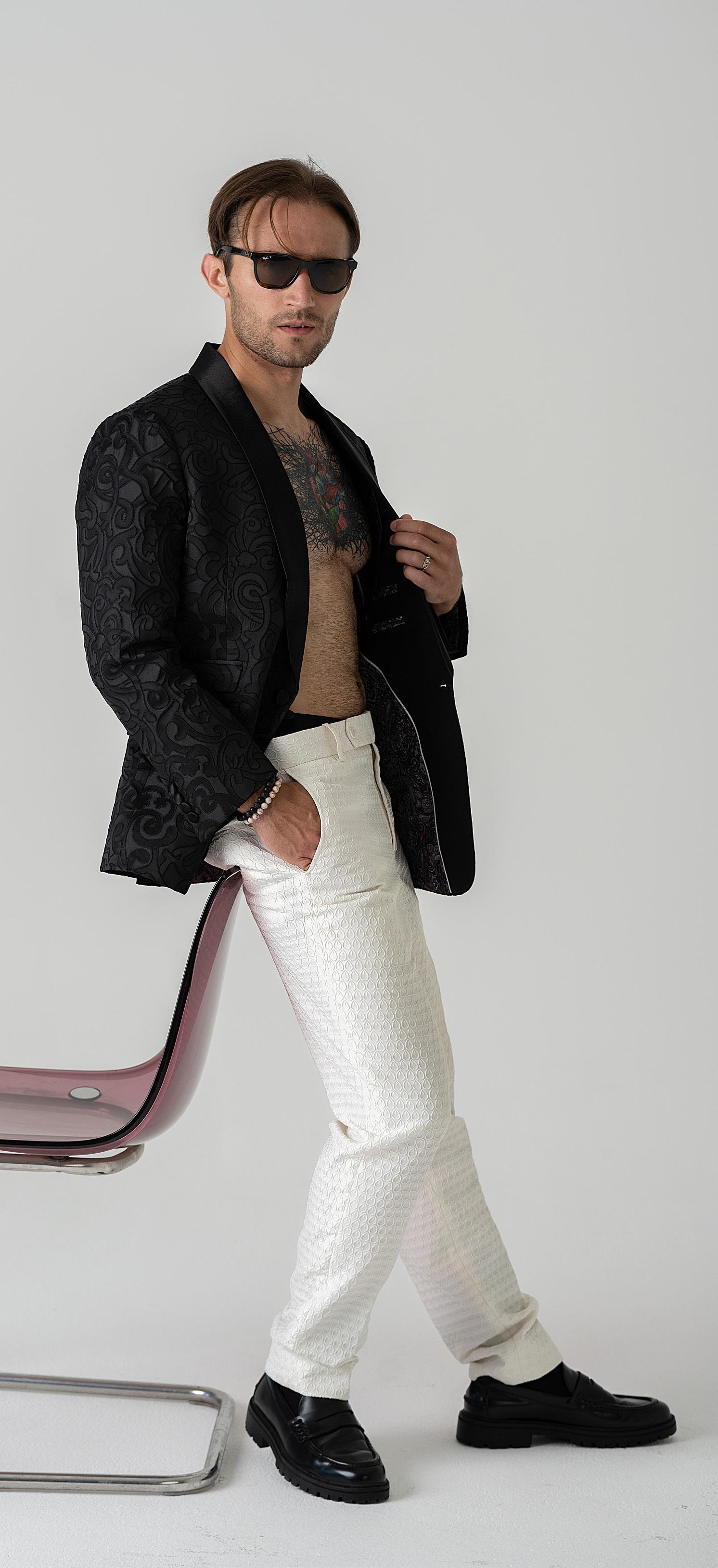 A black textured blazer worn bare-chested, revealing a unique tattoo, paired with cream-colored textured suit pants. This striking look challenges conventional aesthetics, making an audacious statement about individuality and the modern man’s quest for authenticity.