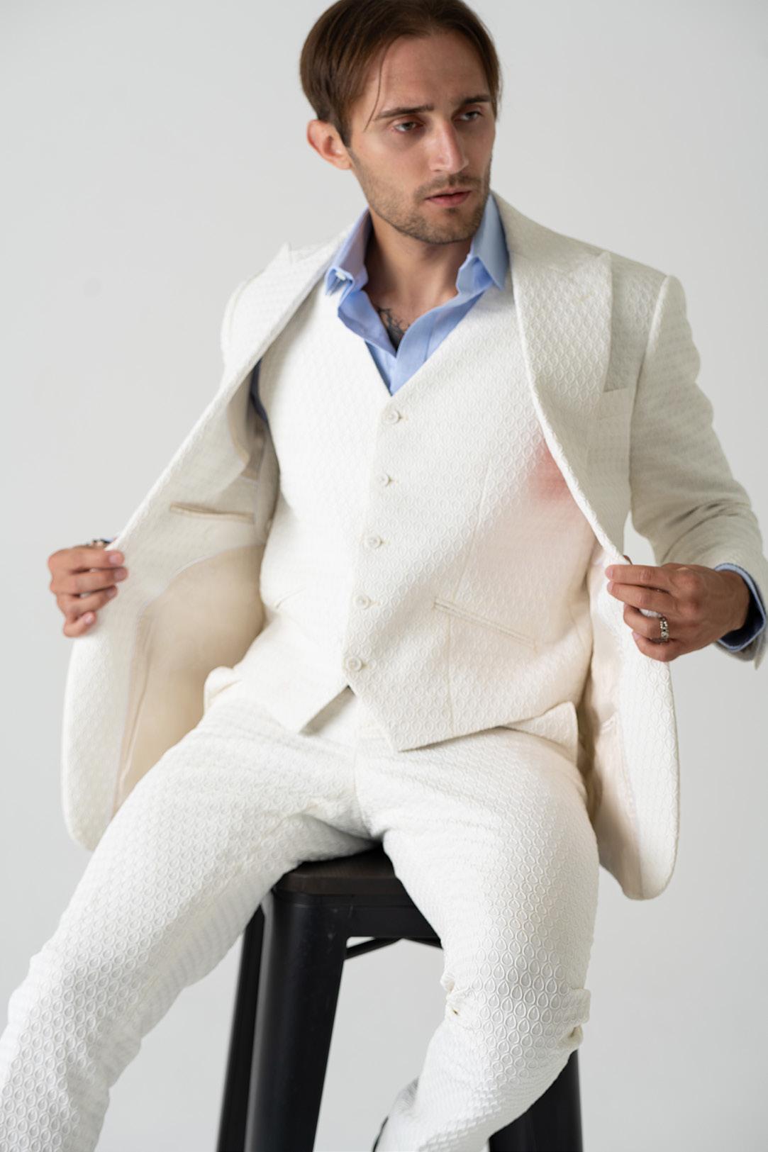 A cream-colored suit is a masterpiece in the realm of men’s fashion. It is a subtle yet striking choice, exuding an aura of understated luxury. The textured fabric adds depth and character to the suit, elevating it from a mere garment to a statement piece. Whether the texture is achieved through fine weaves like herringbone or more pronounced patterns like seersucker, it introduces a tactile dimension that invites admiration.