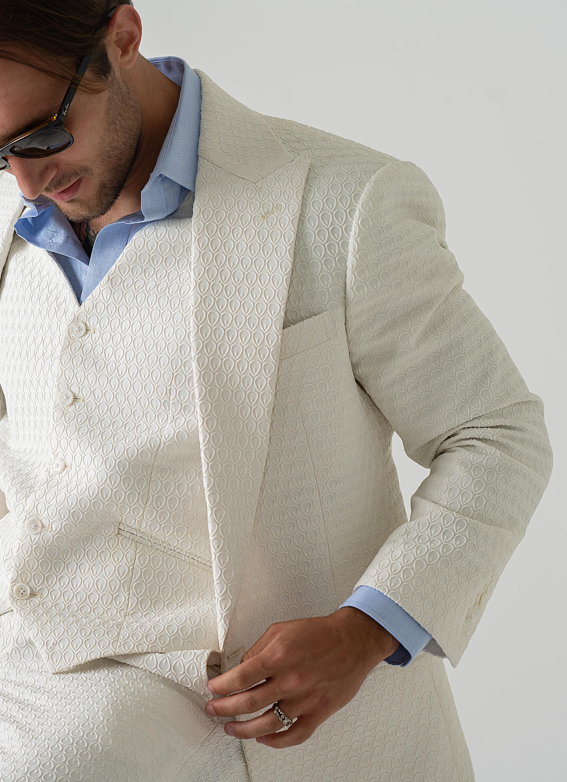 Paired with this elegant suit, a sky-blue shirt provides a refreshing burst of color. The soft, calming hue of the sky-blue contrasts subtly with the cream, creating a harmonious balance. This pairing is reminiscent of a clear summer sky, evoking feelings of serenity and sophistication.