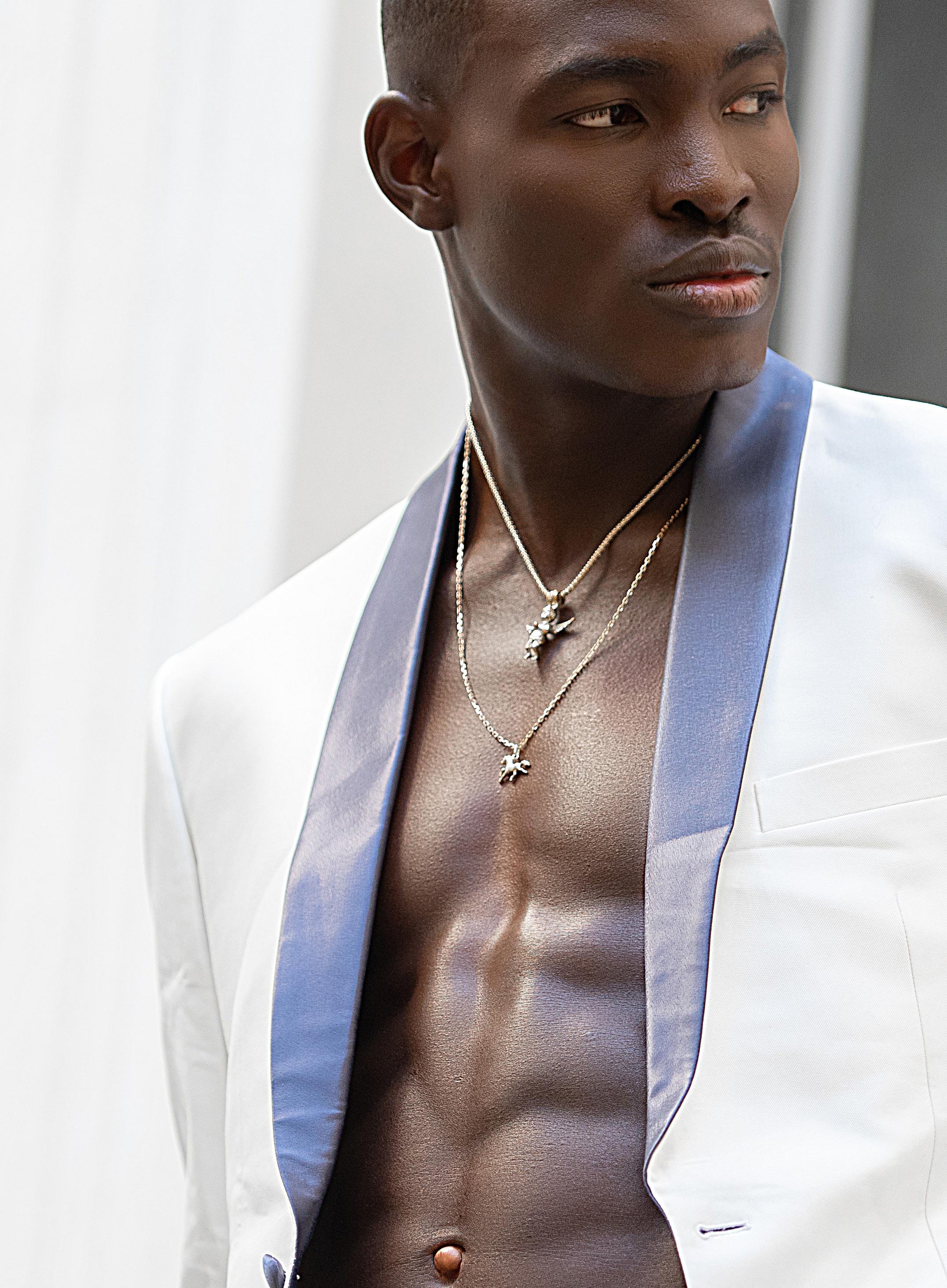 The blazer, with its intricate texture, and its classic cut nods to sartorial tradition, but the decision to wear it bare-chested transforms it into a symbol of personal freedom and strength. The absence of a shirt not only showcases an uninhibited confidence but highlights the narrative etched on the model’s skin—the unique tattoo that peeks through, telling its own story of identity and experience. This interplay between the blazer and the tattoo invites conversations about personal histories and the ever-present blending of culture and fashion.