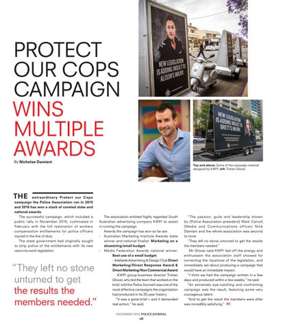 The association enlisted highly regarded South Australian advertising company KWP! to assist in running the campaign. Awards the campaign has won so far are: • Australian Marketing Institute Awards state winner and national finalist: Marketing on a shoestring/small budget. • Media Federation Awards national winner: Best use of a small budget. • Adelaide Advertising & Design Club Direct Marketing/Direct Response Award & Direct Marketing/Non Commercial Award. KWP! group business director Tristan Glover, who led the team that worked on the brief, told the Police Journal it was one of the most effective campaigns the organization had produced in its 25-year history. “It was a great brief – and it demanded real action,” he said. DECEMBER 2016 POLICE JOURNAL