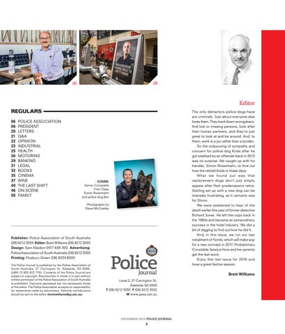 Publisher: Police Association of South Australia (08) 8212 3055 Editor: Brett Williams (08) 8212 3055 Design: Sam Kleidon 0417 839 300 Advertising: Police Association of South Australia (08) 8212 3055 Printing: Finsbury Green (08) 8234 8000