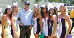 Top row, left: Ken on a 777 dump truck westbound to WA border in July 2006 at Yorkey Crossing, Port Augusta; centre: on escort duties in June 2014 on the Stuart Highway at Glendambo; right: Ken on his last day on the bikes before transferring to Escort Group in September 2011; Bottom row, left: At the March 2008 Clipsal 500 with the grid girls; right: Wright (centre) with David Pluck and Helen Schlueter, Course 49, police academy, 1991.