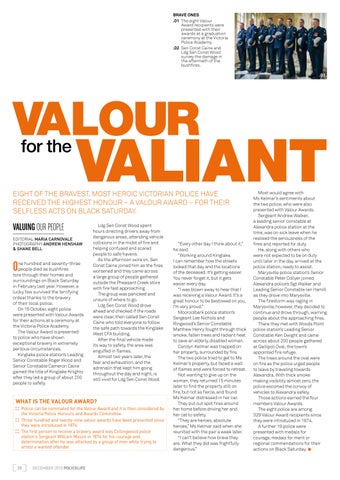 Brave ones .01 The eight Valour Award recipients were presented with their awards at a graduation ceremony at the Victoria Police Academy. .02 Sen Const Caine and Ldg Sen Const Wood survey the damage in the aftermath of the bushfires. .01