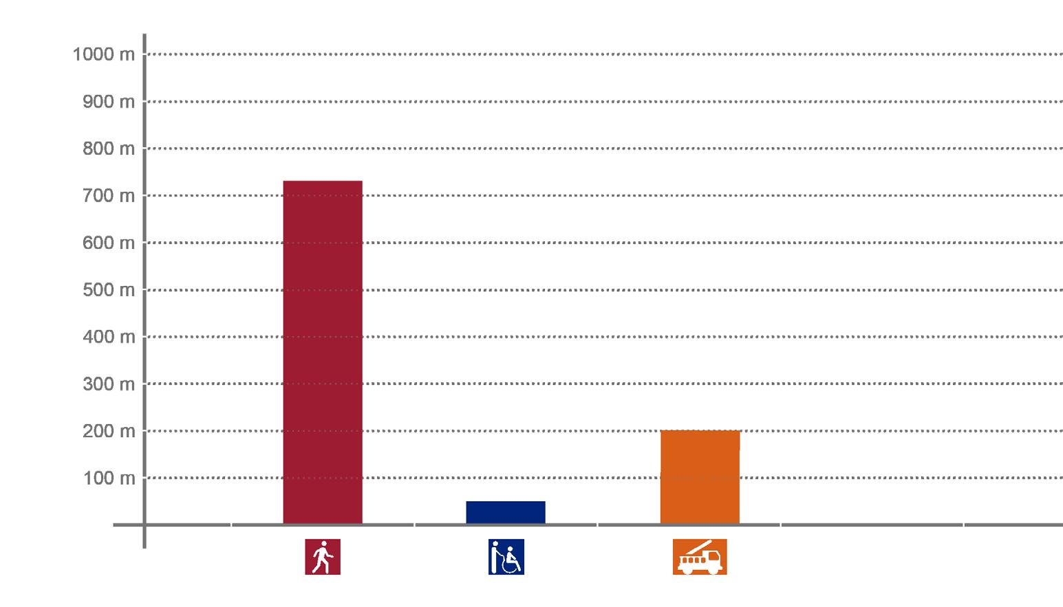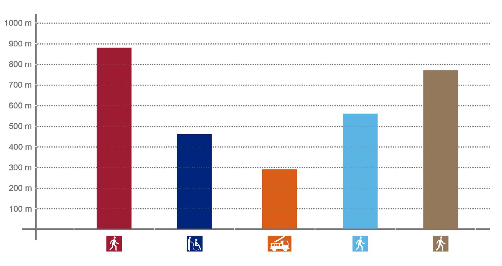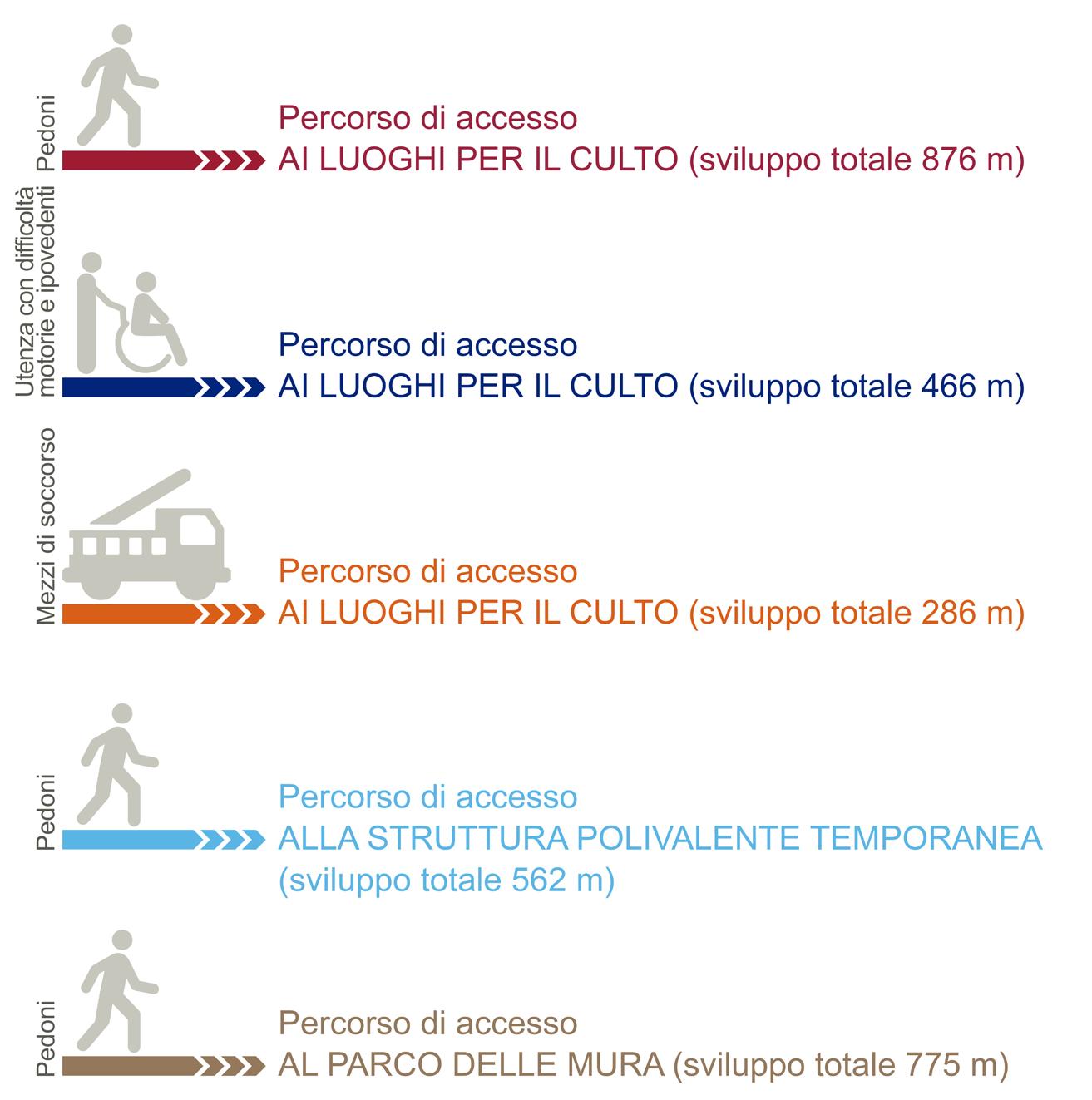 L’aumento dei flussi e delle tipologie di utenze nell’area ha reso necessario la riorganizzazione e riconfigurazione degli accessi, arrivando alla configurazione di un sistema capace di incrementare e differenziare l’accessibilità pedonale all’area; si sottolinea l’aumento di circa il 14% dell’accessibilità per l’utenza con particolari difficoltà visive e motorie.