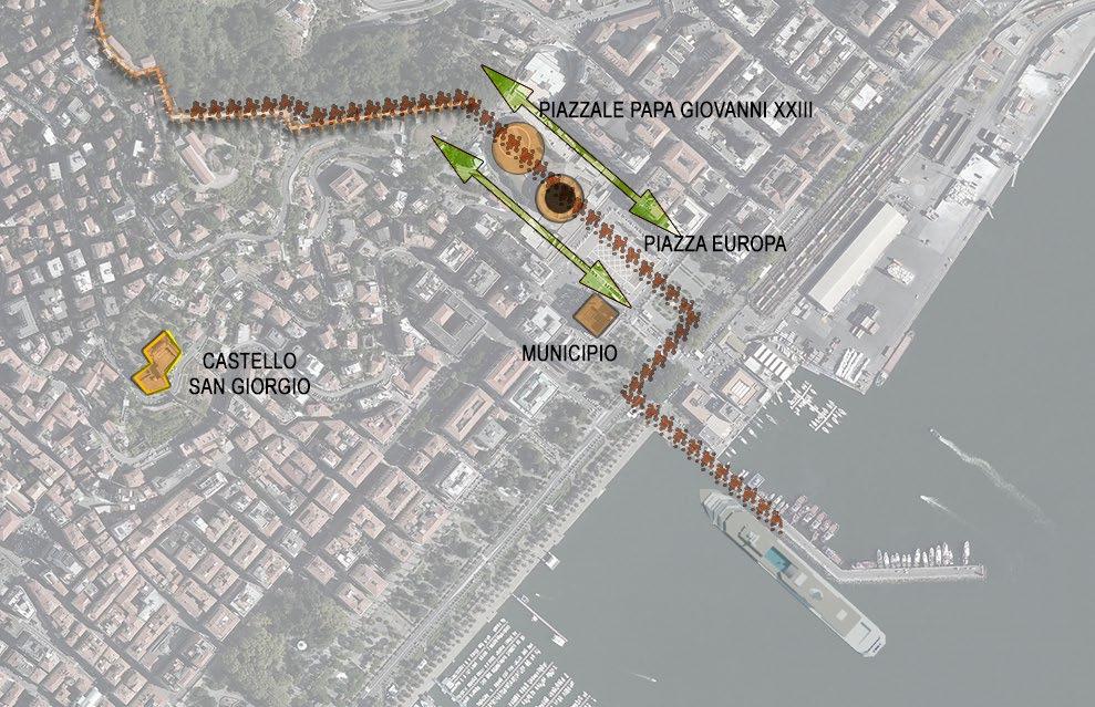 • Capitolo 4 “Gli indirizzi progettuali individuazione degli ambiti progettuali omogenei per operare la riqualificazione funzionale, architettonica, paesaggistica e delle relazioni urbane dell’area”: vengono definiti gli ambiti progettuali di intervento che risultano così suddivisi: ambito progettuale n.1: Piazzale Papa Giovanni XXIII – La porta urbana di Ponente; ambito progettuale n.2: Piazzale Papa Giovanni XXIII – Il sagrato del Golfo; ambito progettuale n.3: Piazzale Papa Giovanni XXIII – Il sagrato del Colle; ambito progettuale n.4: La risalita al Parco delle Mura.