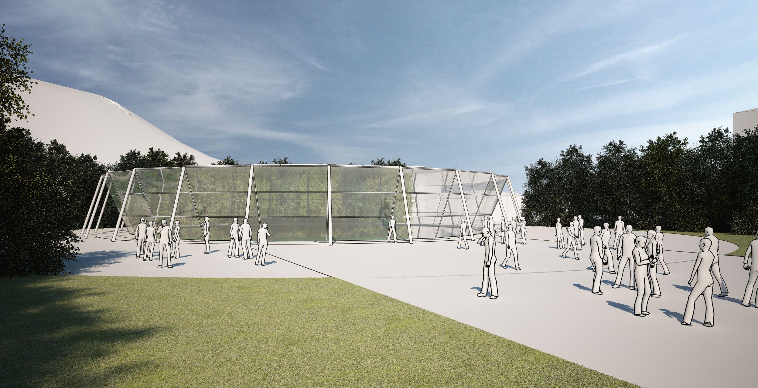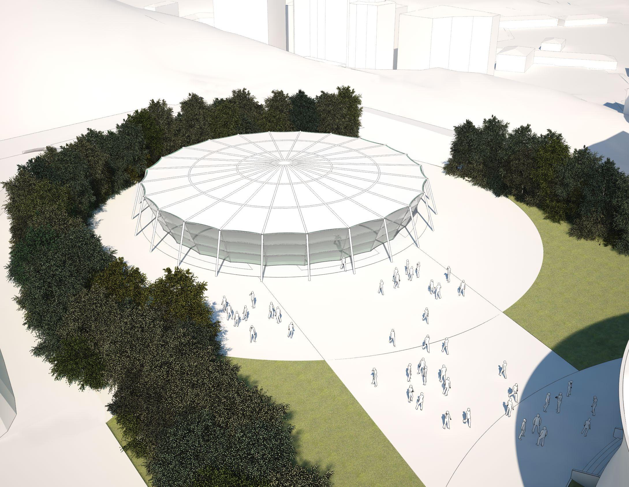 La forma architettonica della nuova struttura, vuole dunque evocare simbolicamente il tabernacolo e la funzione sacra della cattedrale ad essa prospiciente e collegata. La configurazione circolare della nuova struttura vuole inoltre richiamare le forme sia del piazzale sia della cattedrale. In questo modo la struttura dialogherà dal punto di vista formale ed architettonico con il contesto architettonico e paesaggistico di riferimento, permettendone quindi un corretto ed armonico inserimento. La configurazione temporanea della nuova struttura permetterà di verificare nel tempo la reale necessità delle funzioni insediate, arrivando alla sua configurazione permanente secondo due possibili opportunità progettuali: • realizzazione di una nuova struttura polivalente leggera e permanente