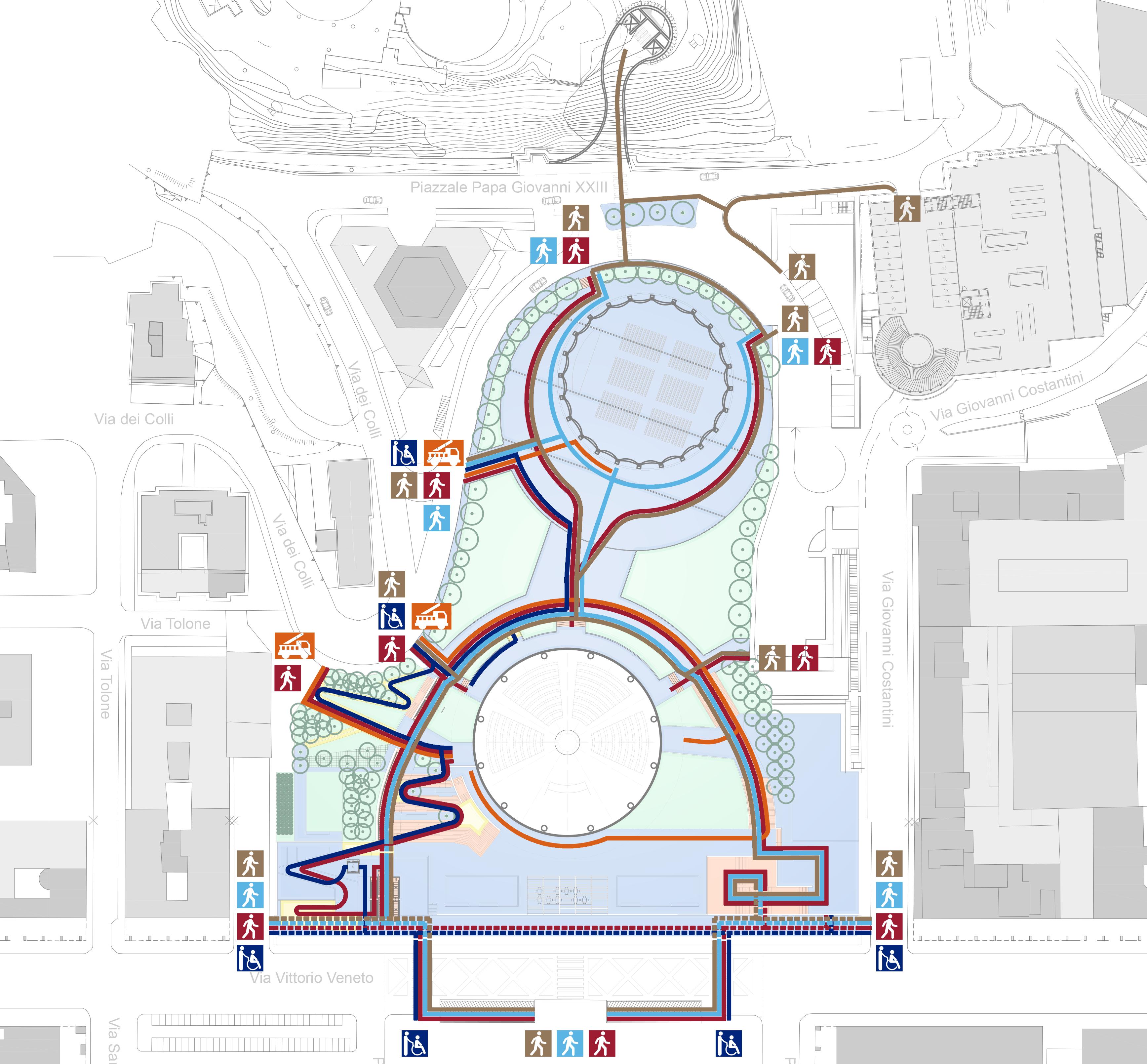 • realizzazione di una nuova struttura polivalente permanente parzialmente in ipogeo e sistemazione del Piazzale Papa Giovanni XXIII secondo il disegno dell’architetto Adalberto Libera
