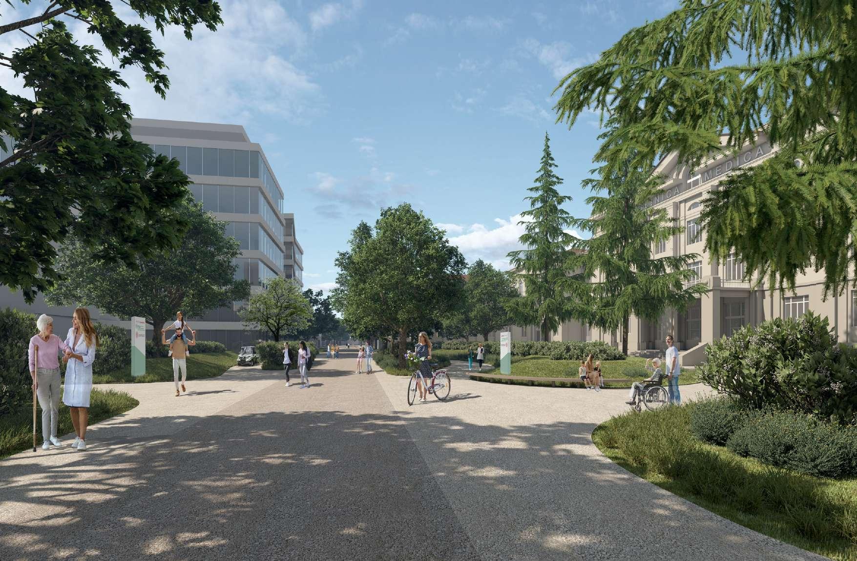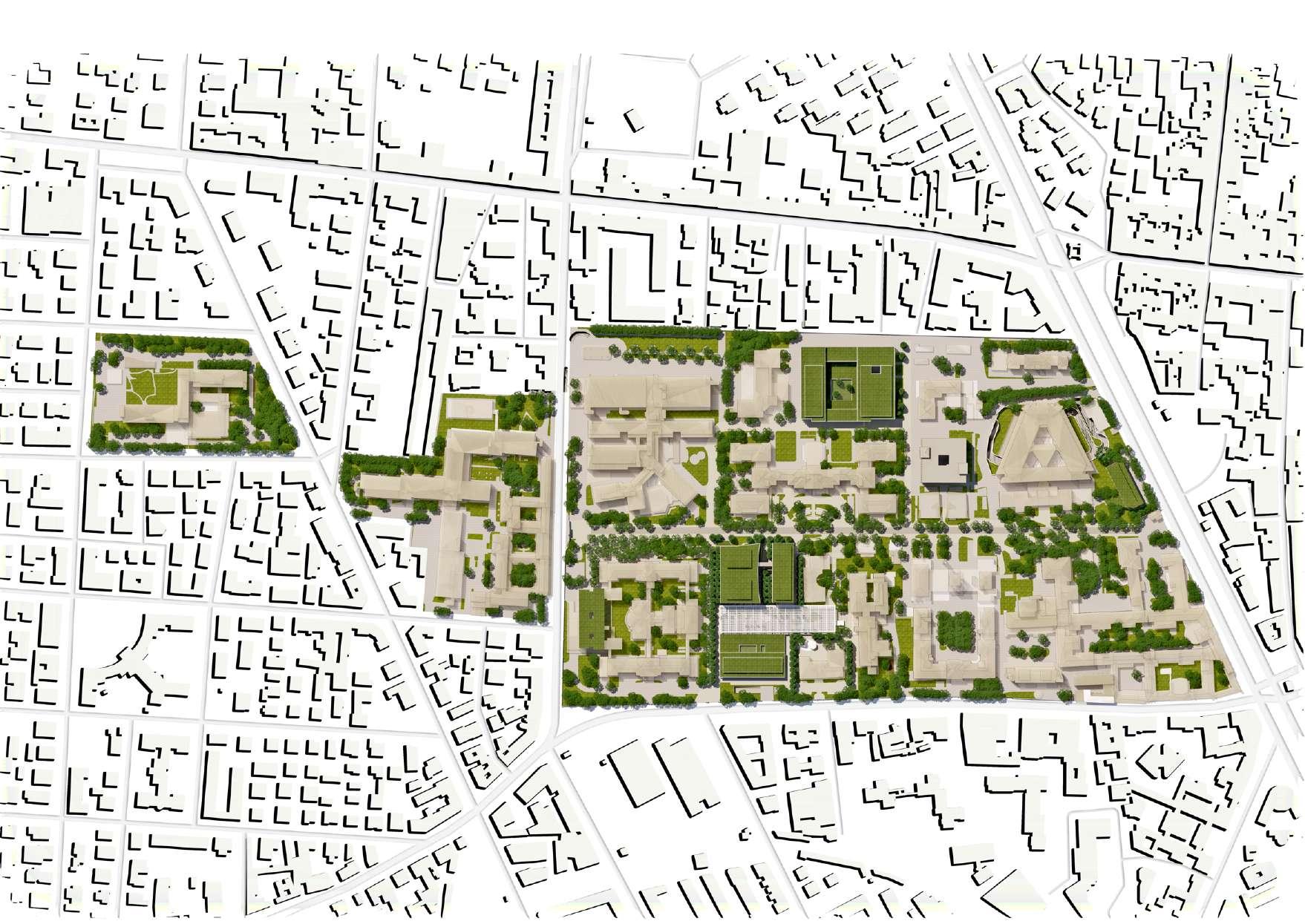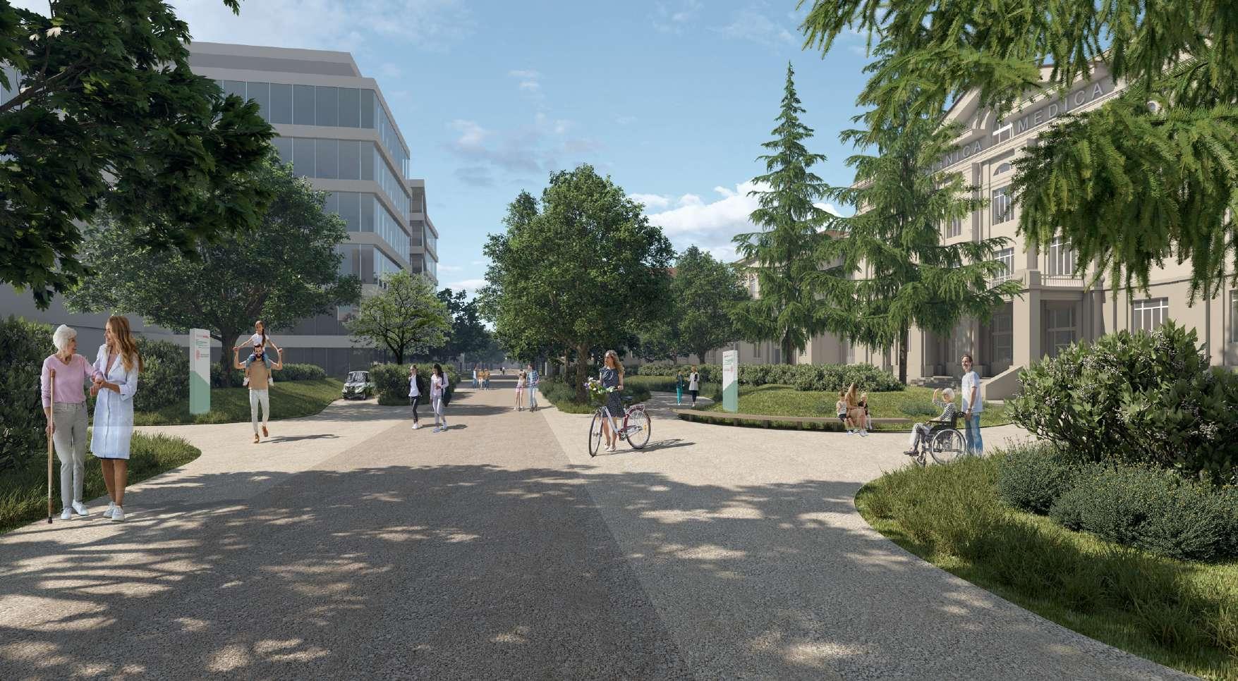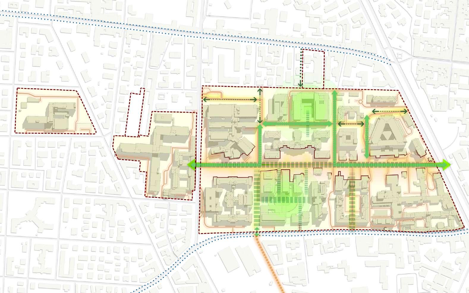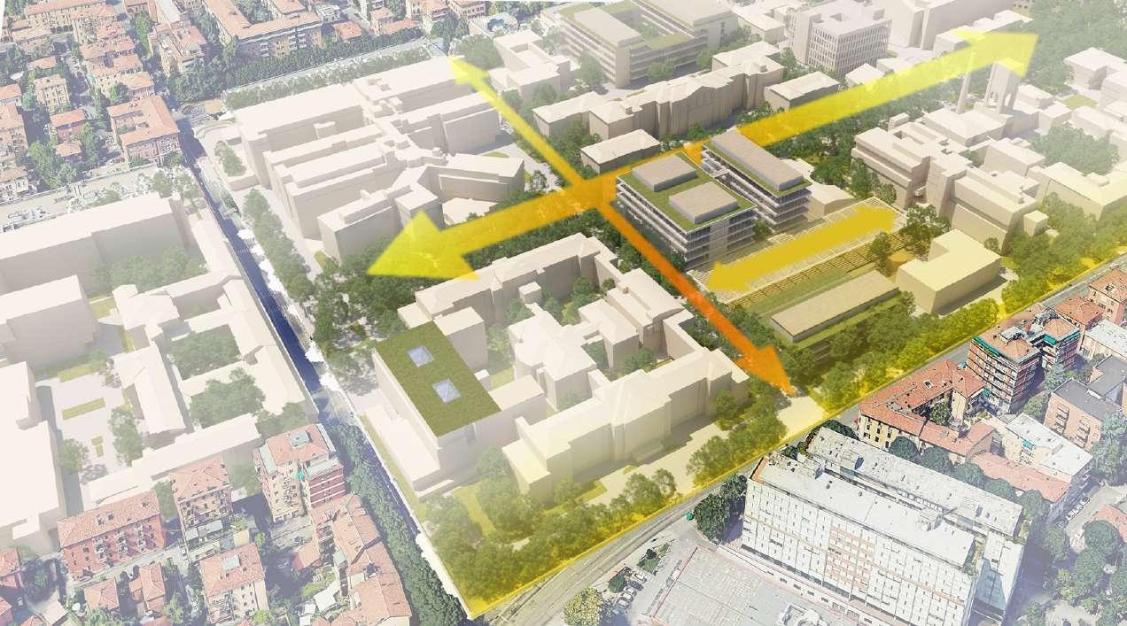L’impLementazione deL SiStema di interazione deL parco urBano con La città conSiSte neL potenziamento deLL’ideaLe aSSe di coLLegamento nord-Sud che da viaLe maSSarenti conduce fino a via mazzini. in particoLare Si SviLuppa L’asse che da via massarenti conduce al viale centrale. QueSta direttrice ha L’importante ruoLo di connettere La porzione di città che Sta a nord deL poLicLinico con iL rinnovato parco urBano evidenziando anche La proSSimità deLLa nuova poLarità coStituita daLLa piazza coperta, che Si trova poco più a Sud, in modo taLe da rendere faciLmente fruiBiLi i Servizi che Si aprono Su di eSSa.