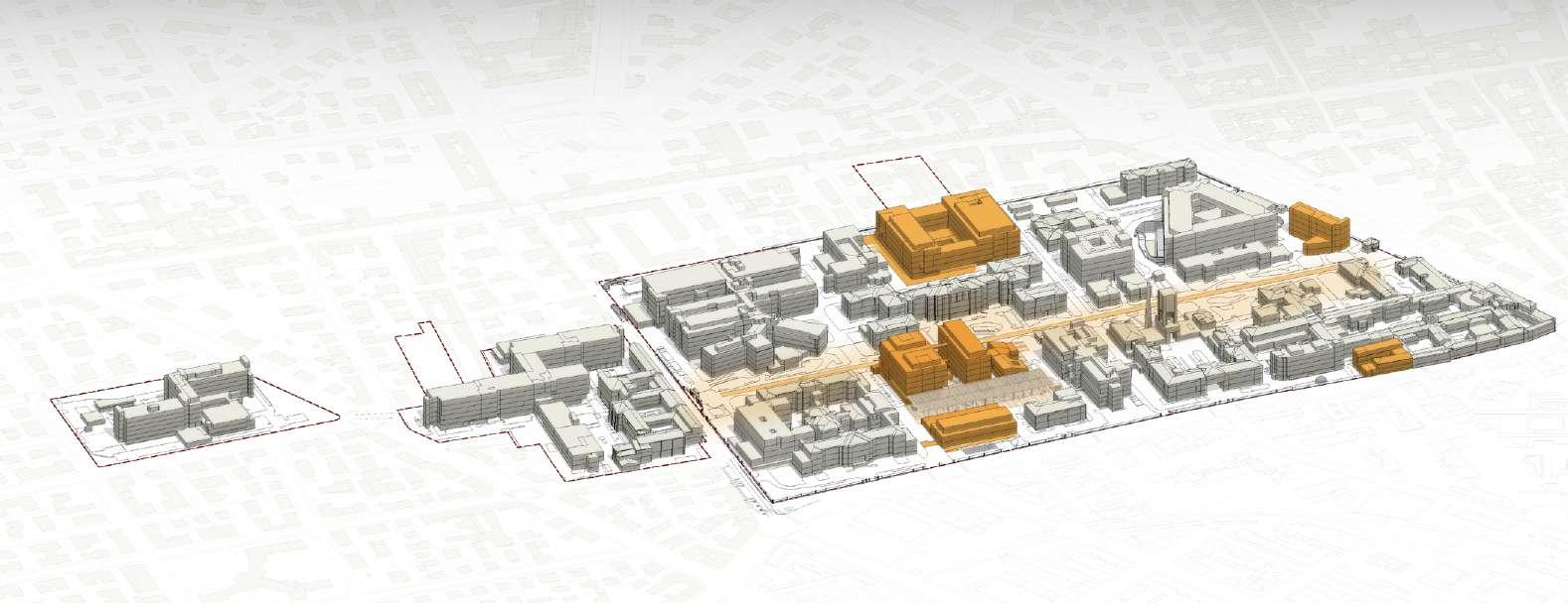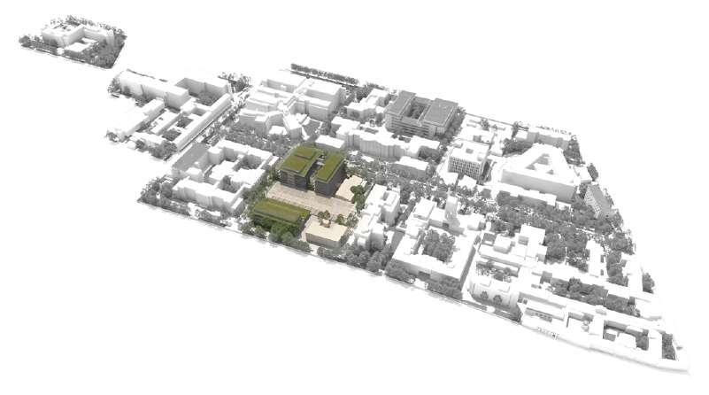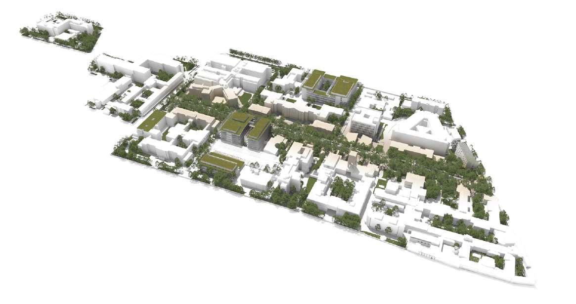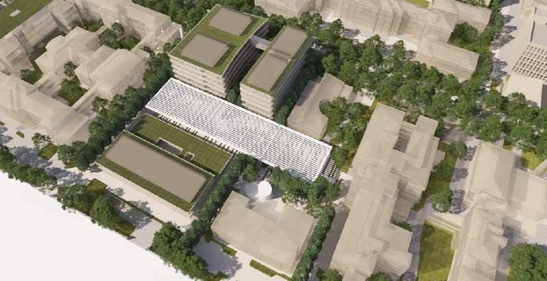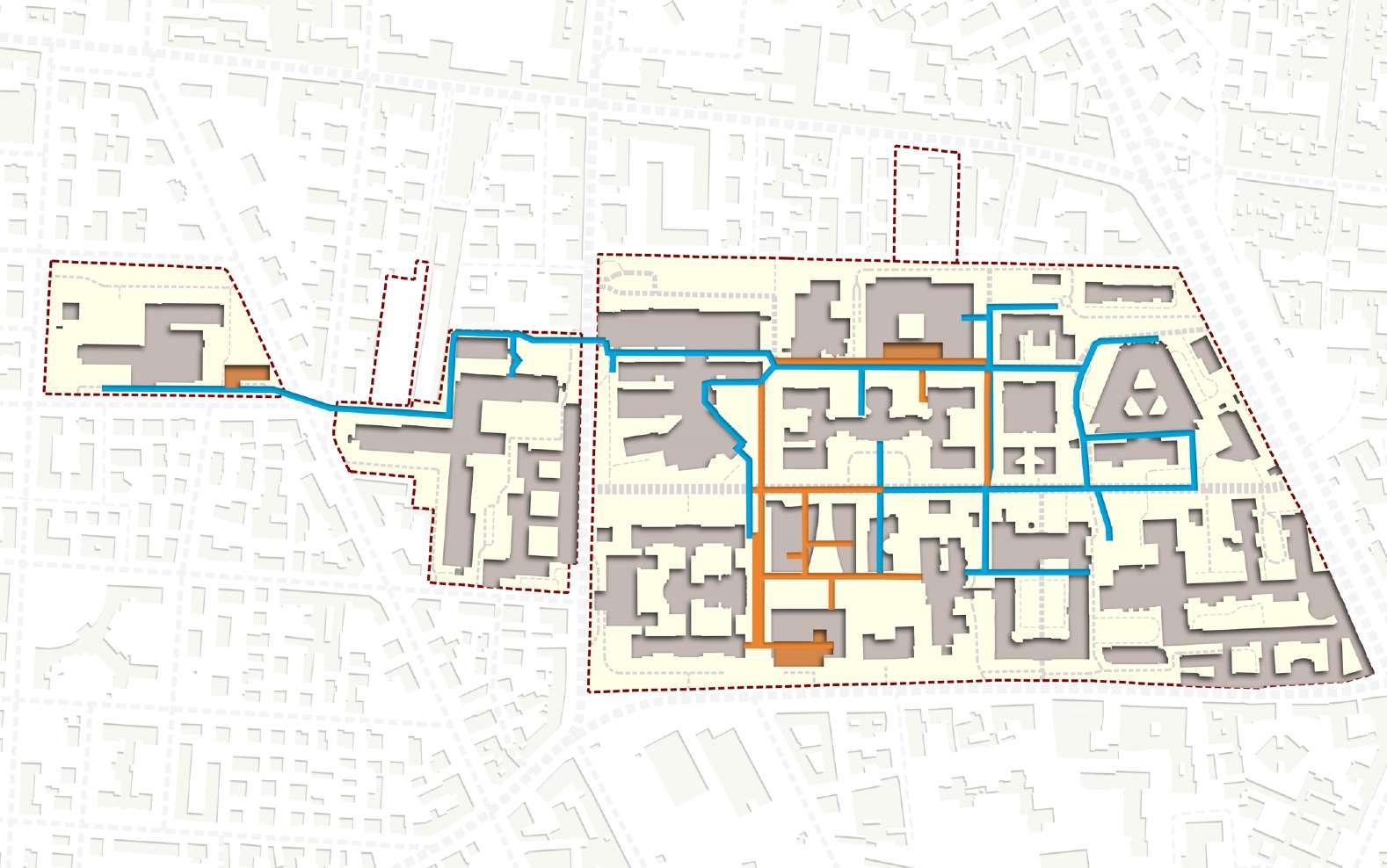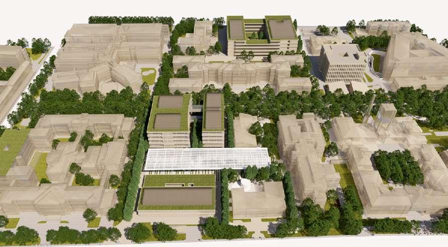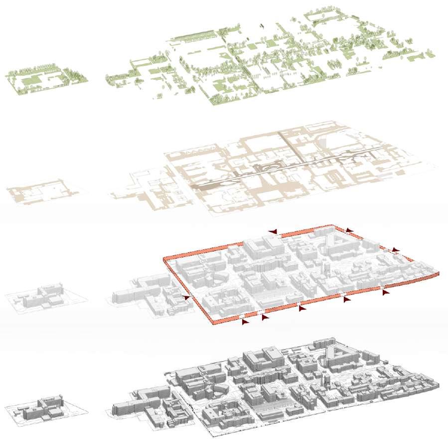 L’impLementazione deL SiStema di interazione deL parco urBano con La città conSiSte neL potenziamento deLL’ideaLe aSSe di coLLegamento nord-Sud che da viaLe maSSarenti conduce fino a via mazzini. in particoLare Si SviLuppa L’asse che da via massarenti conduce al viale centrale. QueSta direttrice ha L’importante ruoLo di connettere La porzione di città che Sta a nord deL poLicLinico con iL rinnovato parco urBano evidenziando anche La proSSimità deLLa nuova poLarità coStituita daLLa piazza coperta, che Si trova poco più a Sud, in modo taLe da rendere faciLmente fruiBiLi i Servizi che Si aprono Su di eSSa.