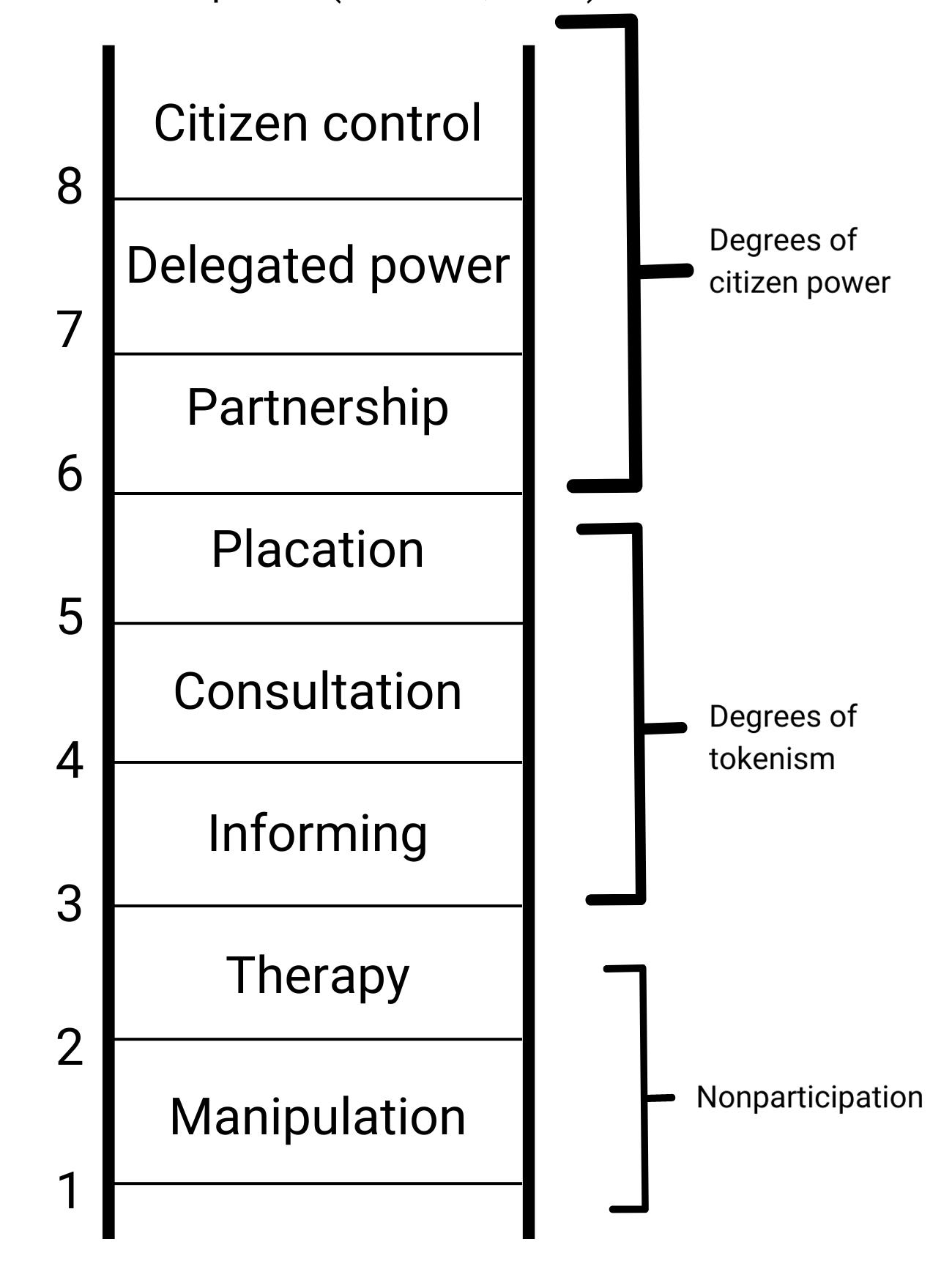 13 Sherry R. Arnstein, “A Ladder Of Citizen Participation,” Journal of the American Planning Association 35, no. 4 (1969): 216–24, https://doi.org/10.1080/01944366908977225.