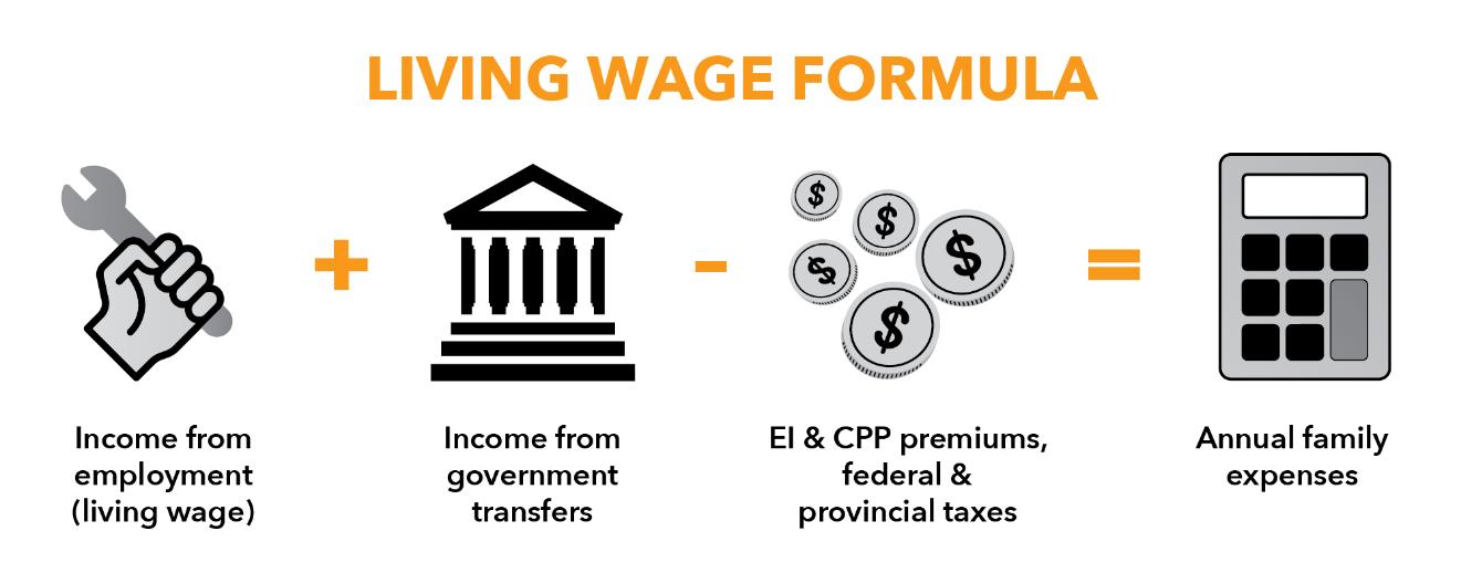 The living wage is calculated as the hourly rate at which a family with two working parents and two young children can meet its basic needs once government transfers have been added to the family’s income (such as federal and provincial child benefits)