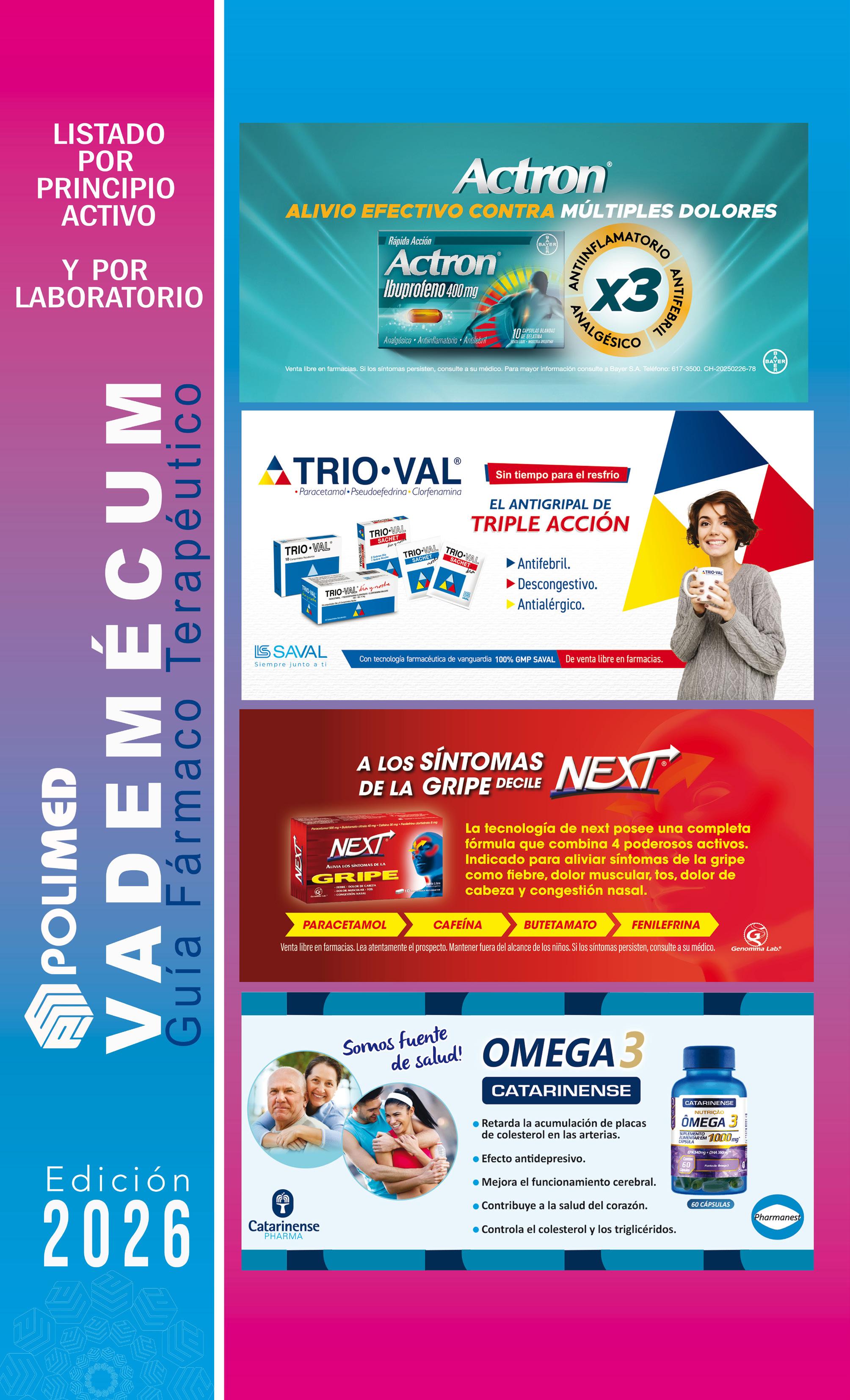 empresas: ABBOTT, ADIUM, ALCON, ANDROMACO, ASEGURADORA YACYRETA, BAYER, CASANELLO, COMFAR, DALLAS, DERMASKIN, DISFAR,DISTRIFARMA, ETICOS, EUROFARMA, GALENO, GENOMMA LAB. GRAMON, INDEX, ISIS PHARMA, MATHER, MEGALABS COMPANY, PHARMANEST, PROMOFARMA, SALUMAX cuyos directivos eligieron este canal para la divulgación de información acerca de sus productos, e invitamos a los demás laboratorios a acercar, durante el año 2025, material informativo y datos actualizados de sus productos para la edición 2026. Muchas gracias.
