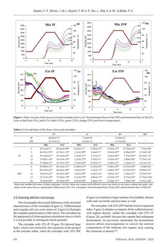 Mix Ext Mix Ext Mix Ext 0 90.21±0.5aA 85.00±0.48aB -0.42±0.1eB -0.29±0.01bA 9.24±0.52aB 14.70±0.02aA 7.55±0.99b bA bB dB aA bB bA 5 84.47±1.29 63.76±1.33 1.21±0.28 3.64±0.1 5.56±0.45 8.38±0.09 21.05±2.34a cA cB cB aA bB bA JF 10 79.16±0.62 59.10±0.65 2.10±0.21 3.71±0.1 5.36±0.82 7.79±0.06 20.29±1.17a 15 74.58±1.04dA 56.91±0.19cB 3.22±0.27bB 3.67±0.1aA 5.43±0.43bA 5.80±0.08cA 17.70±1.05a 20 73.58±0.31dA 54.37±1.91dB 3.52±0.03aB 4.07±0.1aA 5.38±0.12bA 5.56±0.21cA 19.23±1.91a aA B dB eA B A 0 90.48±0.35 85.61±0.12ª -0.38±0.01 -0.32±0.02 9.34±0.22ª 13.91±0.04ª 6.68±0.26c 5 83.03±0.25bA 64.64±0.49bB 1.96±0.05cB 3.65±0.11dA 6.28±0.22bB 10.27±0.06bA 18.89±0.37ª JNF 10 78.23±0.22cA 60.62±0.48cB 3.32±0.04bB 4.43±0.16cA 5.85±0.16cB 9.36±0.21cA 17.99±0.50ª 15 75.21±0.36dA 57.64±0.19dB 4.15±0.03ªB 4.86±0.11bA 6.25±0.11bB 8.77±0.06dA 17.76±0.54ab eA dB aB aA bB eA 20 72.43±0.89 56.59±0.59 4.45±0.09 5.40±0.15 6.22±0.11 7.29±0.18 15.91±1.44b Mean and standard deviation of three replicates. For the Tukey test, means with different lower case letters in the same column and upper case letters in the same line are significantly different (p≤0.05). Ext: extrudates, Non-fermented flour of Jab (JNF) and fermented flour of Jab (JF).