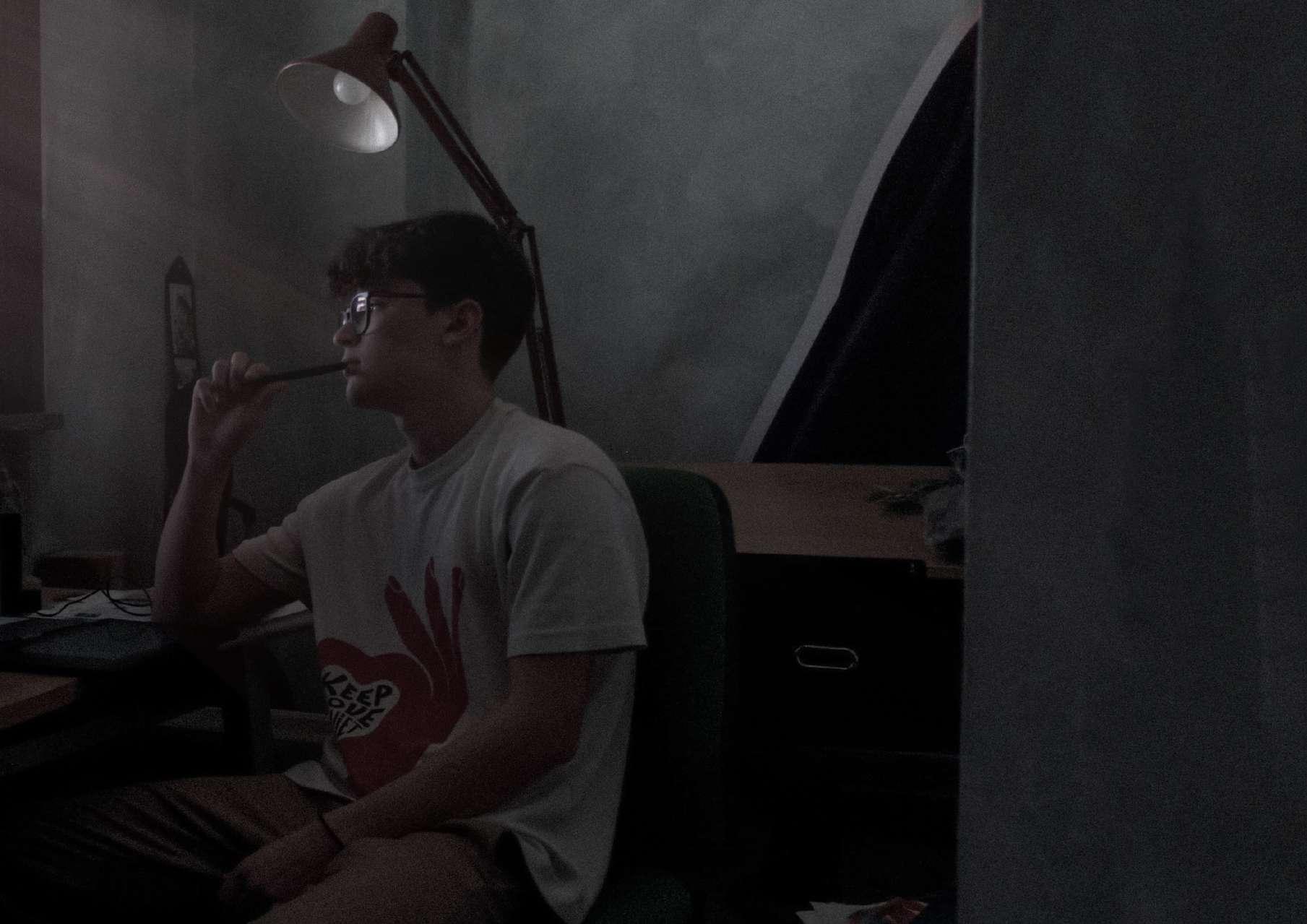 Nella terza e nella quarta foto ho scelto di fotografare me stesso all’interno della mia stanza, sono foto che mi rappresentano in uno stato riflessivo in cui spesso mi trovo quando sono in camera mia, è lo spazio in cui in assoluto mi sento più a mio agio, so che quando mi siedo alla mia scrivania ci sono solo io e nessun altro e quindi ho la possibilità di esprimermi come meglio desidero.