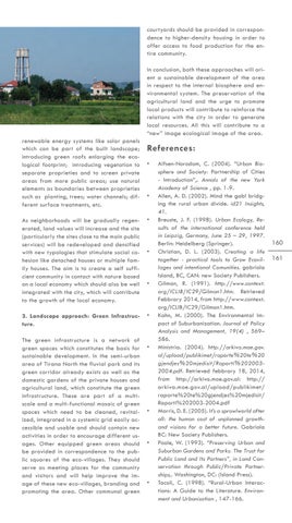 courtyards should be provided in correspondence to higher-density housing in order to offer access to food production for the entire community. In conclusion, both these approaches will orient a sustainable development of the area in respect to the internal biosphere and environmental system. The preservation of the agricultural land and the urge to promote local products will contribute to reinforce the relations with the city in order to generate local resources. All this will contribute to a “new” image ecological image of the area. renewable energy systems like solar panels which can be part of the built landscape; introducing green roofs enlarging the ecological footprint; introducing vegetation to separate proprieties and to screen private areas from more public areas; use natural elements as boundaries between proprieties such as planting, trees; water channels; different surface treatments, etc.