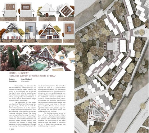 rat. In order to preserve the form of a square, and roofs, a 45° rotation of the building was carried out. This intervention served as a contrast to the traditional architecture, as a new and interesting perspective. These modules were inspired by the traditional architecture of Berat. To create a variety of hotel rooms, several modules with different specifications were created. Family rooms, suites, and collective rooms were some of the proposed modules. These modules were designed as independent, creating a greater freedom for the hotel’s visitors and connected by joint facilities. The facilities created on the island will serve the hotel and its visitors. New functions will also be implemented in the island in order to better serve the city of Berat. The final product of this thesis seeks to boost the growth of tourism in the city of Berat, thus creating new jobs and influencing its growth.