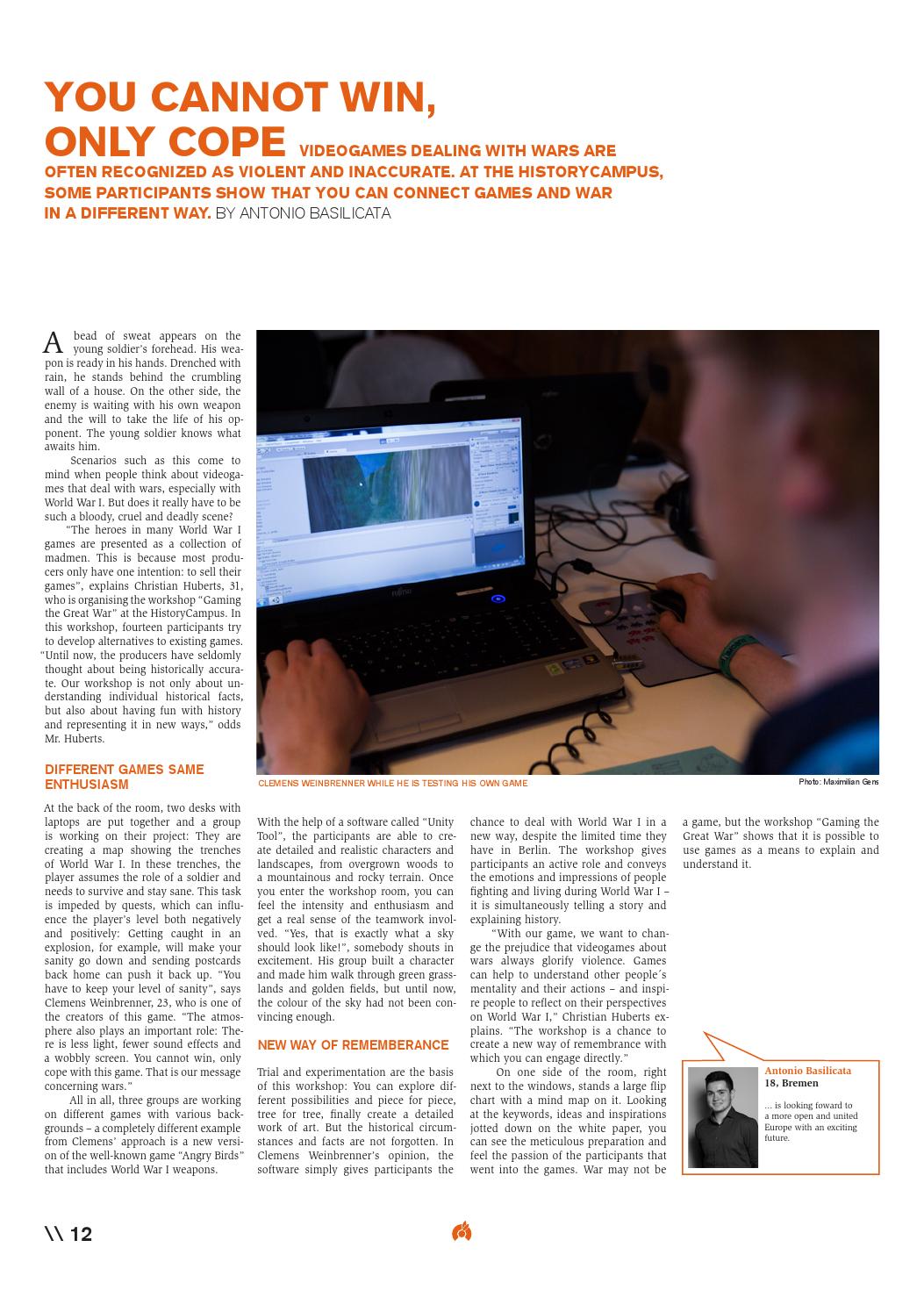 Different Games same enthusiasm At the back of the room, two desks with laptops are put together and a group is working on their project: They are creating a map showing the trenches of World War I. In these trenches, the player assumes the role of a soldier and needs to survive and stay sane. This task is impeded by quests, which can influence the player’s level both negatively and positively: Getting caught in an explosion, for example, will make your sanity go down and sending postcards back home can push it back up. “You have to keep your level of sanity”, says Clemens Weinbrenner, 23, who is one of the creators of this game. “The atmosphere also plays an important role: There is less light, fewer sound effects and a wobbly screen. You cannot win, only cope with this game. That is our message concerning wars.” All in all, three groups are working on different games with various backgrounds – a completely different example from Clemens’ approach is a new version of the well-known game “Angry Birds” that includes World War I weapons.