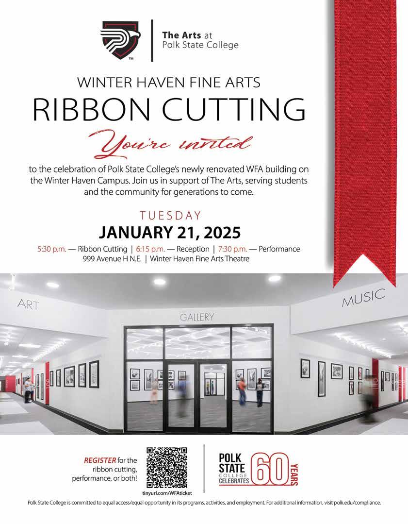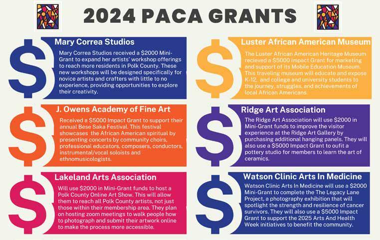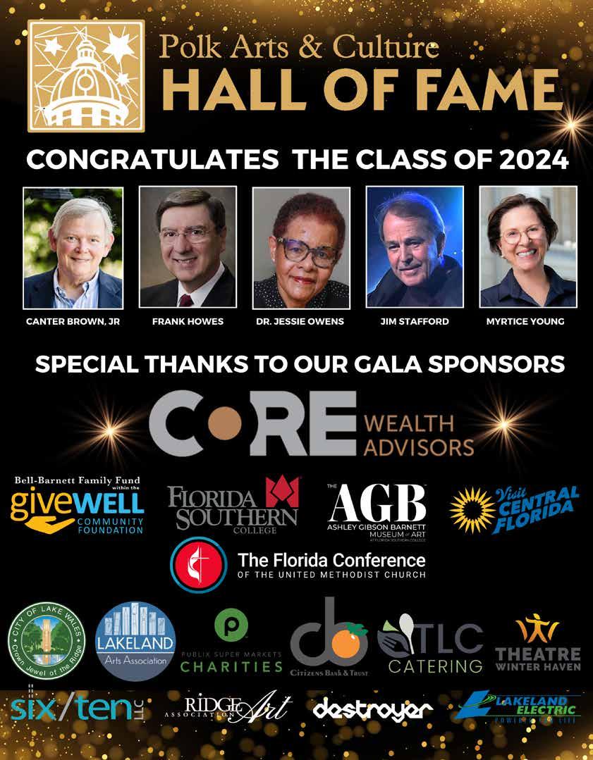 Despite the rescheduling, the Gala was a wonderful celebration of Polk’s arts and culture scene. You can find a list of the Annual Award winners on Page 17 and photos of our newest Hall of Fame Class on Page 19. Additionally, thanks to our patrons and our generous sponsors, PACA will be able to use the funds raised from the Hall of Fame Gala to further support our artists and arts and cultural organizations here in Polk County. We remain committed to being good stewards of the sponsorship dollars and ticket revenue.
