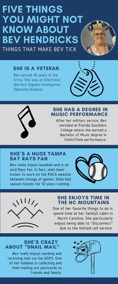 Finally, I would be remiss if I didn’t take the opportunity to publicly thank Bev Hendricks, our loyal and faithful Art-i-facts editor for her many years (13+) of service to the Polk Arts & Cultural Alliance. This issue is Bev’s final issue as editor, and we’ll miss her work ethic and her design aesthetic. In addition to her work for PACA, I’d also like to thank Bev for her tireless advocacy for Polk’s arts and cultural organizations – especially ones that often go unnoticed. In fact, it was Bev who first suggested that PACA should consider Dr. Jessie Owens for induction into to the Hall of Fame for her many years of arts education service to the children of Winter Haven. And while Art-i-facts will miss Bev’s touch, I’m confident she’ll still be out supporting artists and arts and cultural events around our county – that’s just who she is!