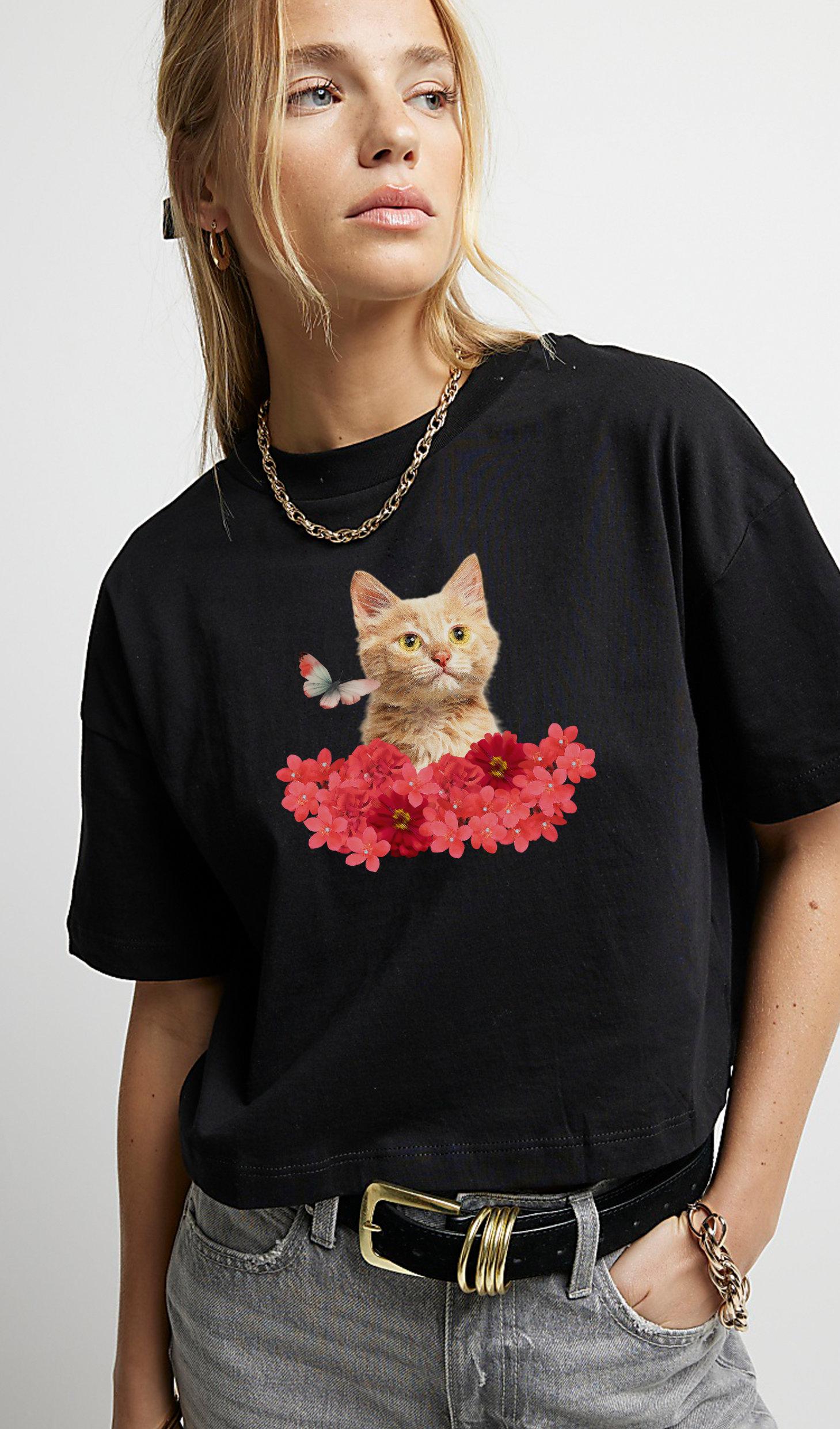 3.FloralFelineT-shirtwithscreenprintgraphic,goldglittereyedetailandhotfxrhinestone forals(whitebaserelaxedt-shirt)