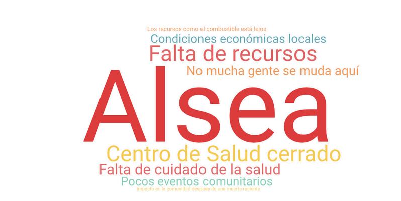 La remota ubicación de Alsea es una fortaleza y una preocupación para los participantes en este mapeo de recursos Ellos describen a su comunidad como única debido a su aislamiento y valoran su hermoso entorno natural Uno de los participantes explicó que Alsea llama a cierto tipo de persona, personas que escogen vivir en un entorno aislado.