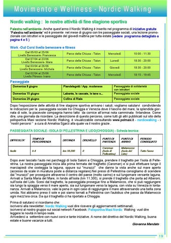 Movimento e Wellness - Nordic Walking Nordic walking : le nostre attività di fine stagione sportiva Palestra nell’ambiente- Anche quest’anno il Nordic Walking è inserito nel programma di iniziative gratuite “Palestra nell’ambiente” ed è presente nel mese di giugno con tre passeggiate sociali, una lezione promozionale con istruttori e le passeggiate del giovedì mattina per tutta estate (vedere programma dettagliato a pagina 4 e 5 )