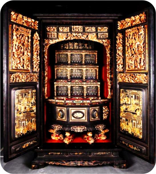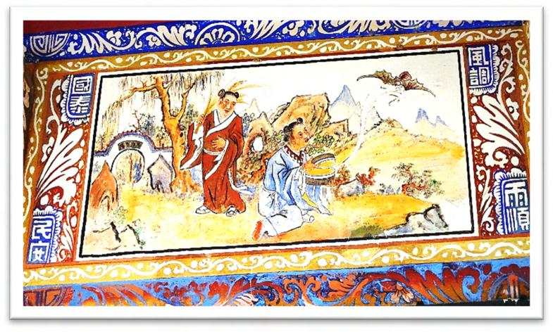 山手棒打開的圓盒,拾得手持禾穗,旁有蝙蝠兩隻